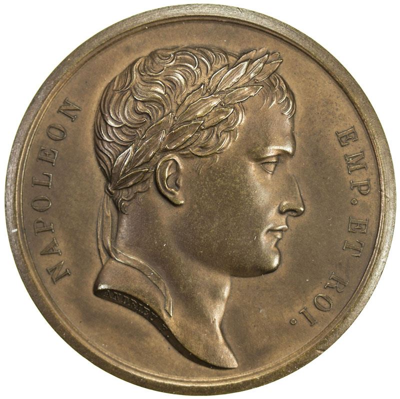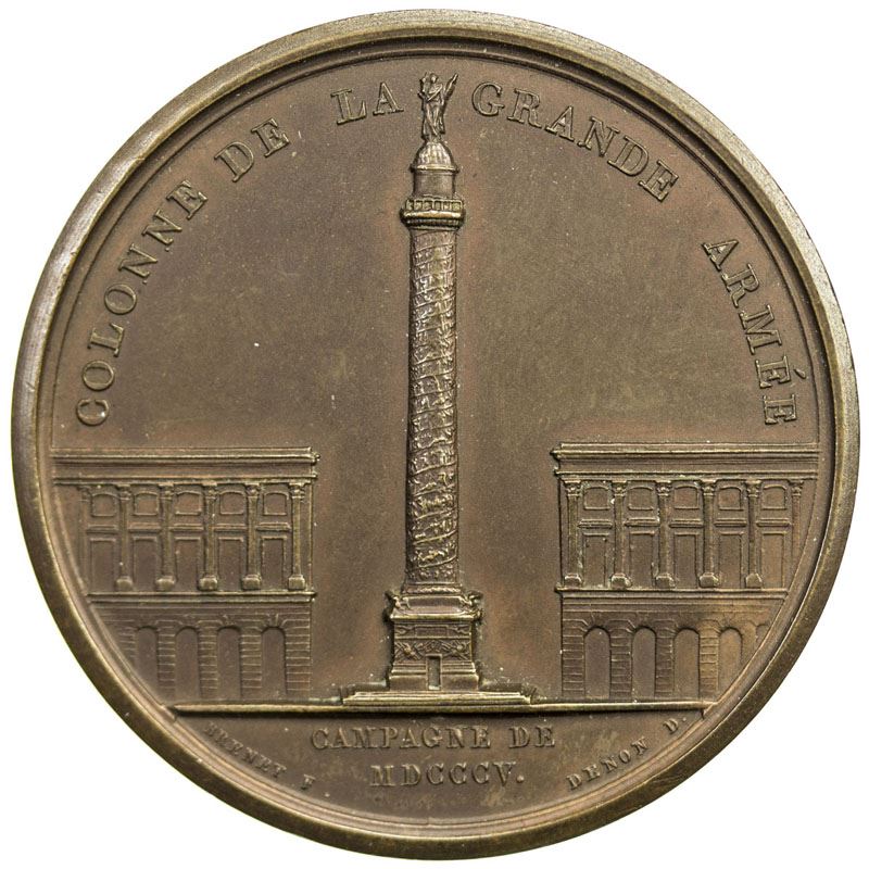 FRANCE: Napoleon I, as Emperor, 1804-1815, AE medal (34.55g), 1805, Bramsen-463, Slg. Julius-1482, Monn. de Paris S. 59 D, 42mm bronze medal by Andrieu and Brenet, laureated bust of Napoleon right with NAPOLEON EMP. ET ROI. around and ANDRIEU F. on truncation / Column of the Grand Army on the Place Vendome in Paris with COLONNE DE LA GRANDE ARMÉE around and CAMPAGNE DE MDCCCV. in exergue with BRENET F. DENON D. in small letters at bottom, hints of red, later restrike, Unc.