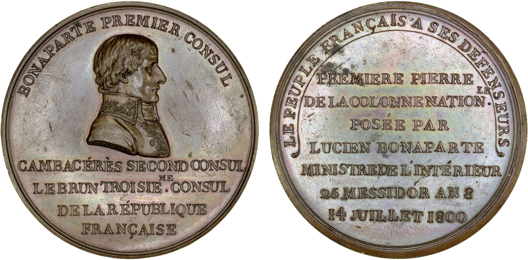 FRANCE: Napoleon I, as First Consul, 1799-1804, AE medal (97.88g), 1800, cf. Bramsen-63, Forrer I:688, 56mm bronze medal for the National Column of Place Vendôme by Pierre Simon Benjamin Duvivier, uniformed bust of Napoleon right with BONAPARTE PREMIER CONSUL above and CAMBACÉRÈS SECOND CONSUL / LEBRUN TROISIEme. CONSUL / DE LA RÉPUBLIQUE / FRANÇAISE below // "LE PEUPLE FRANÇAIS A SES DÉRENSEURS / PREMIERE PIERRE / DE LA COLONNENATIONle. / POSÉE PAR / LUCIEN BONAPARTE / MINISTREDE L'INTÉRIEUR / 26 MESSIDOR AN 8 / 14 JUILLET 1800", mostly brown, some red, a few marks in right obverse field, plain edge, AU. Lucien, brother of Napoleon Bonaparte and Minister of the Interior, laid the first stone of a column at Place Vendome on July 14, 1800 (25 Messidor Year VIII). Without success, the idea was resumed in 1803 by the First Consul who confirmed the erection of a column at Vendome Square like the one raised in Rome, in honor of Trajan, decorated with 108 figures of the departments assembled in spiral form and surmounted by the statue of Charlemagne. First dedicated to the Glory of the French People, the column would quickly become the glory of Napoleon I, but the construction was slow and it was not until 1805 and the melting of 1200 guns taken from the enemy that the project, revived by Vivant Denon, advanced. Completed in 1810 and dedicated to the glory of the victorious armies, the column was named the Column of the Grand Army. A statue of Napoleon as Caesar by the sculptor Antoine-Denis Chaudet (1763-1810) was placed at the top.