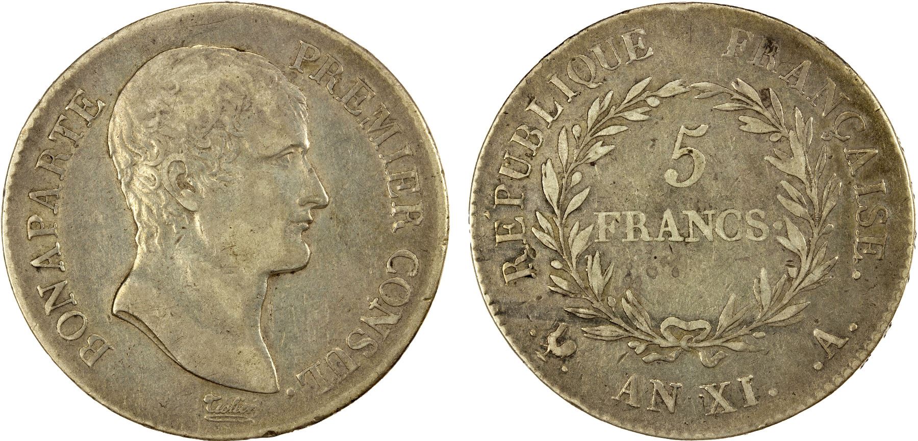 FRANCE: Napoleon I, as First Consul, 1799-1804, AR 5 francs, AN 11 (1802-3), KM-659.1, light toning, some luster, one-year type, VF, ex Almer H. Orr III Collection.