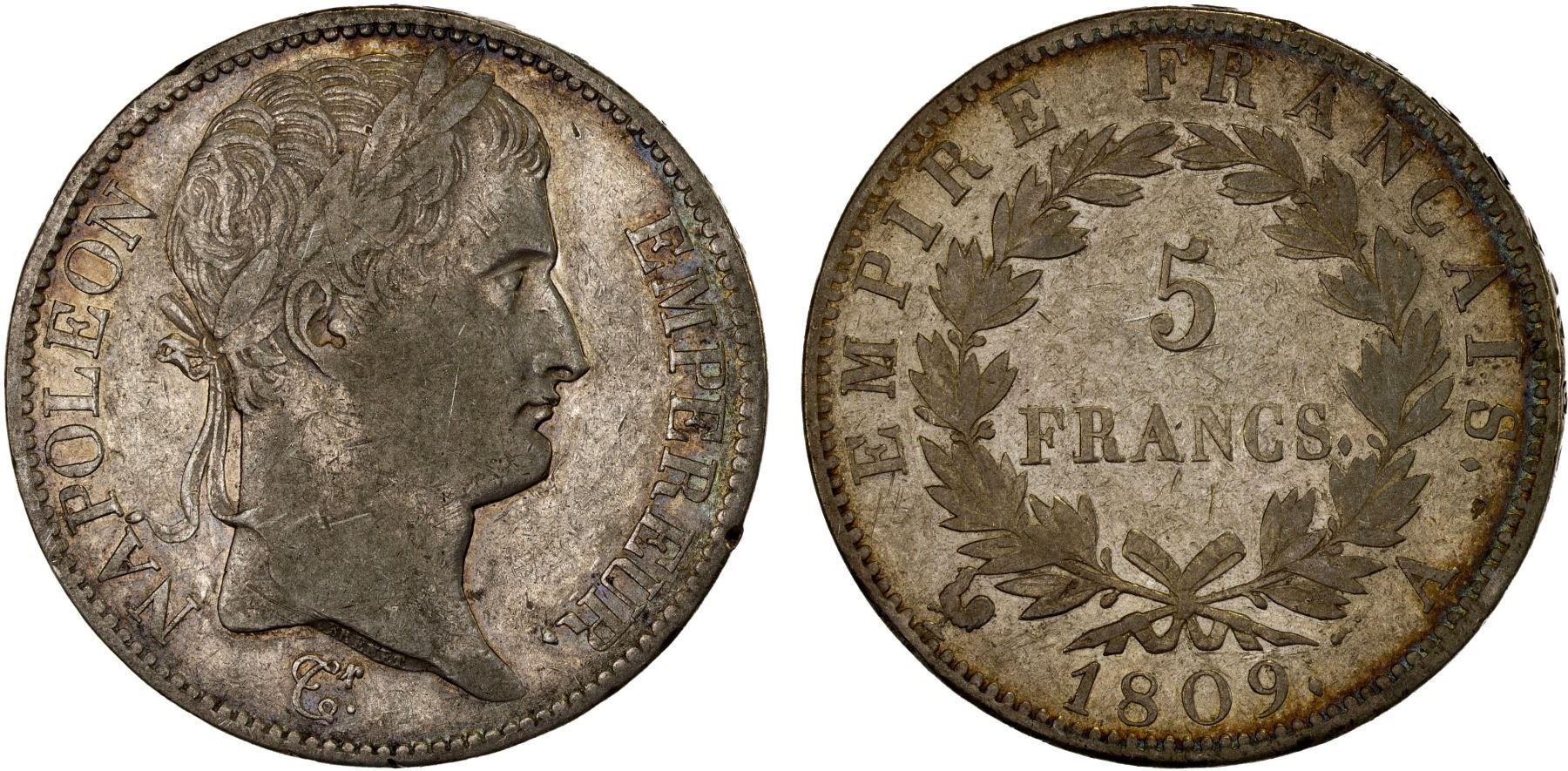 FRANCE: Napoleon I, first reign, 1804-1814, AR 5 francs, 1809-A, VF-XF