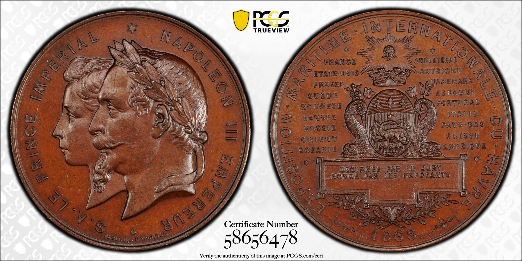 FRANCE: Napoleon III, 1852-1870, AE medal, 1868, 40mm bronze medal by Charles Trotin for the International Maritime Exhibition in Havre; NAPOLEON III EMPEREUR S. A. LE PRINCE IMPERIAL around jugate busts of Napoleon III and the Prince Impérial, the future Napoleon IV, under a star, and HAMEL INV. C. TROTIN SC. below // "EXPOSITION MARITIME INTERNATIONALE DU HAVRE 1868" around cartouche inscribed DECERNÉE PAR LE JURY / NOMMÉ PAR LES EXPOSANTS under the arms of Le Havre crowned and supported by two dolphins, with FRANCE / ETATS-UNIS / PRUSSE / SUÈDE / NORWÈGE / HANSES / RUSSIE / ORIENT / OCÉANIE / ANGLETERRE / AUTRICHE / DANEMARK / ESPAGNE/ PORTUGAL / ITALIE / PAYS-BAS / SUISSE / AMÉRIQUE, a superb mint state example! PCGS graded MS65.