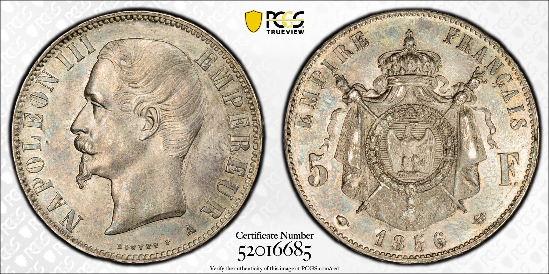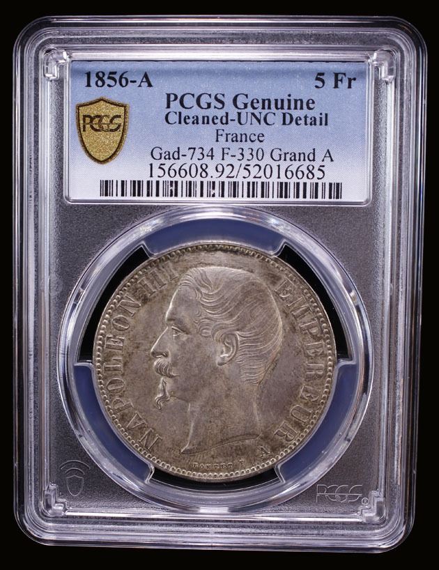 FRANCE: Napoleon III, 1852-1870, AR 5 francs, 1856-A, KM-782.1, lightly cleaned, PCGS graded Unc details.