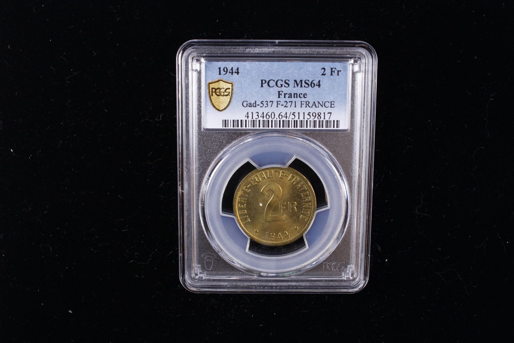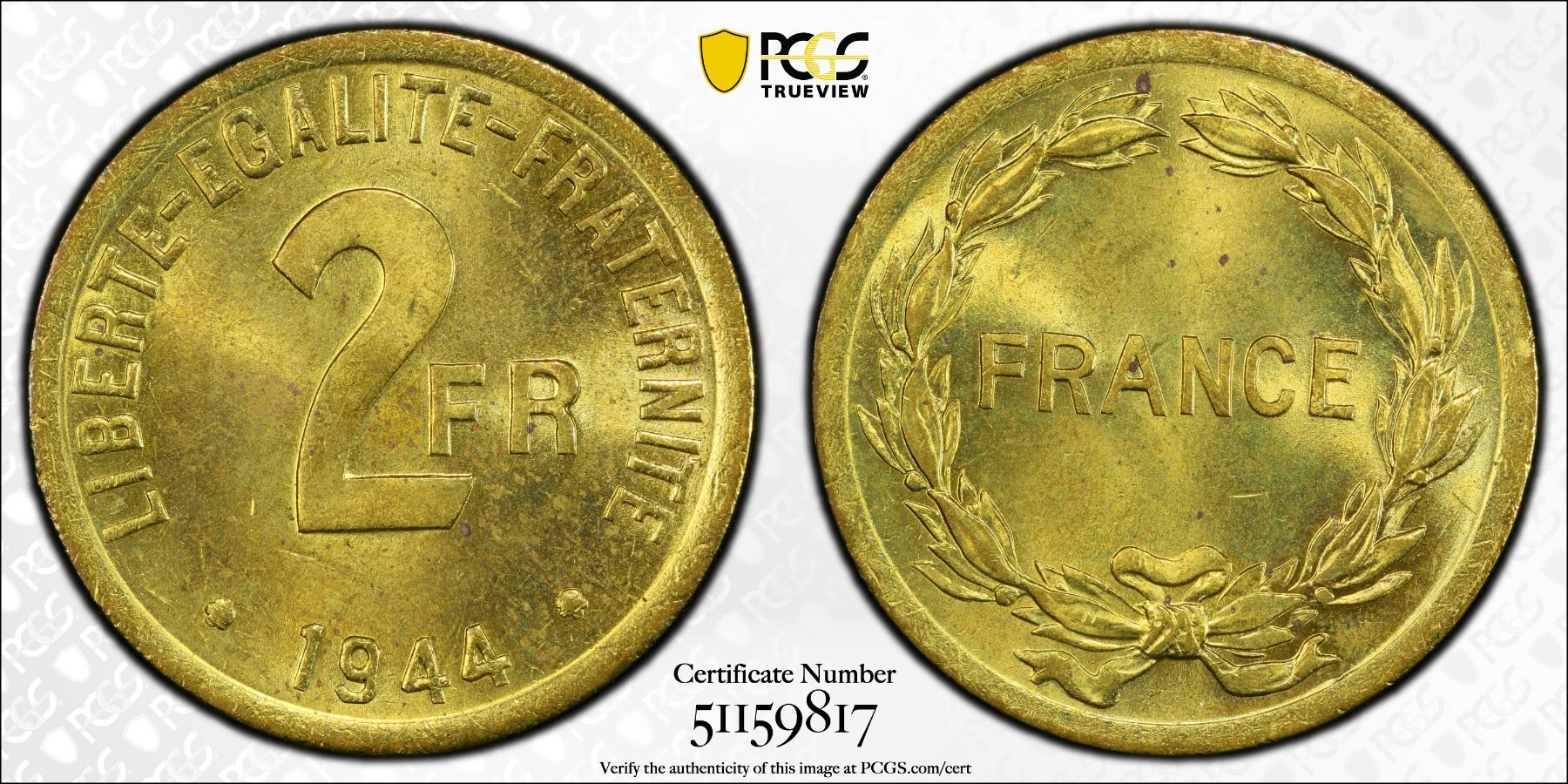 FRANCE: Provisional Government of the French Republic, brass 2 francs, 1944, KM-905, F-271, Gad-537, a wonderful example, PCGS graded MS64. Soldiers involved in the landing of Provence received these coins, which circulated in the south of France and Algeria.