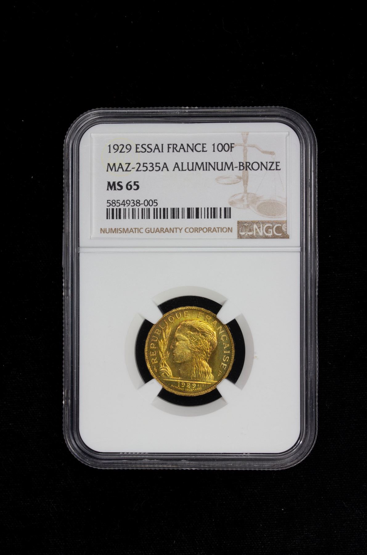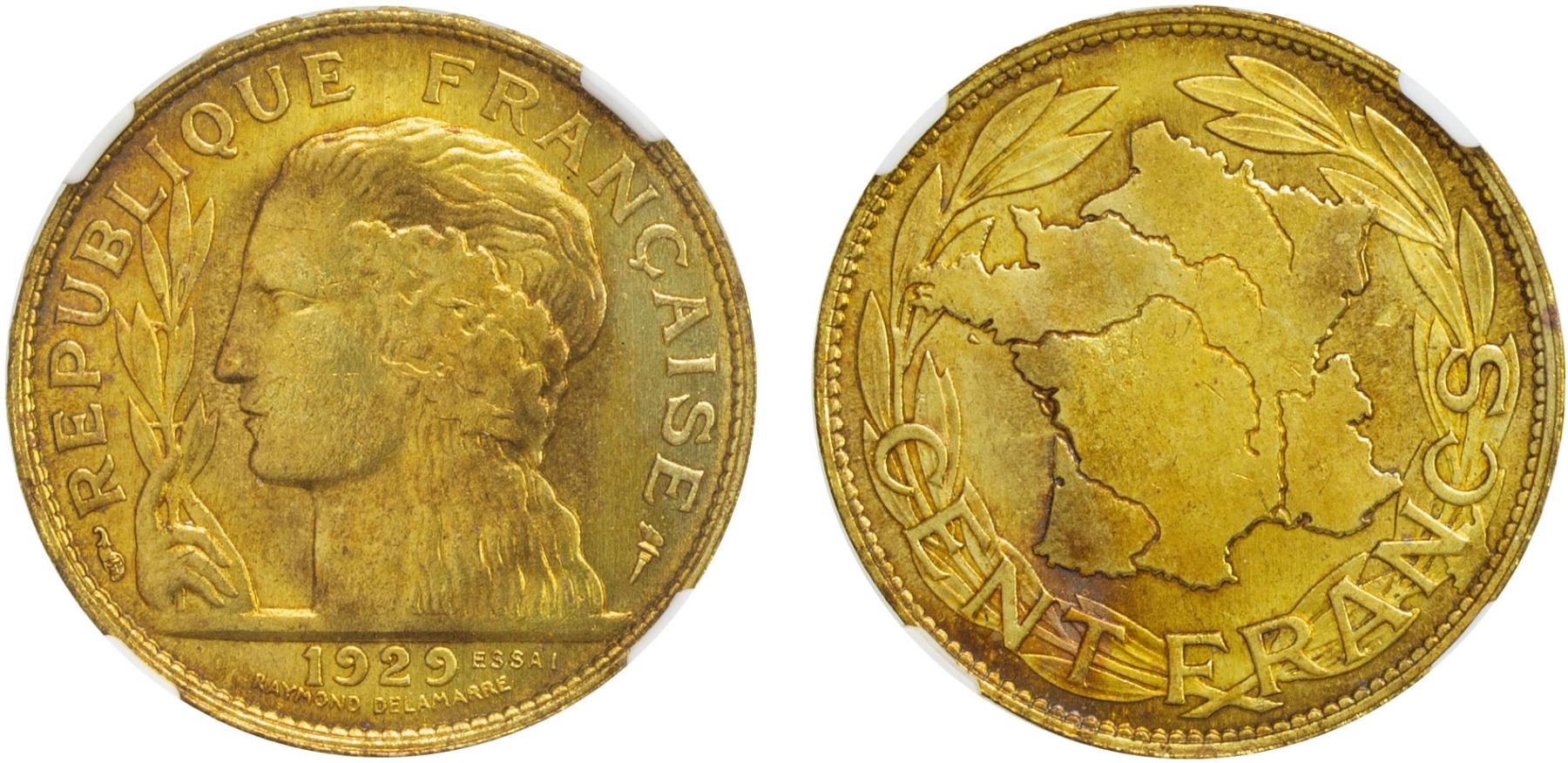 FRANCE: Republic, 100 francs, 1929, Mazard-2535A, as KM-E31, essai in Aluminum-Bronze, prooflike (though not noted on label), NGC graded MS65.