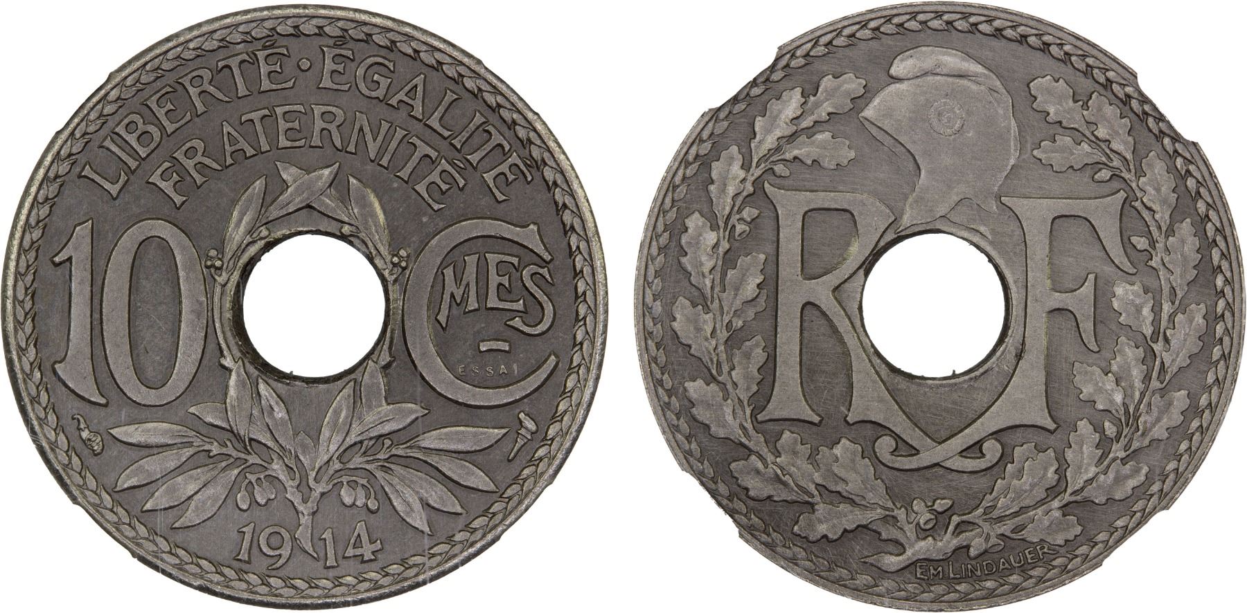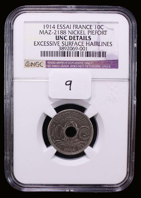 FRANCE: Republic, 5 centimes, 1914, GEM-39.EP, Maz-2188, essai piefort strike in nickel, heavy hairlines on reverse, NGC graded Unc details, ex The 1914 Collection.