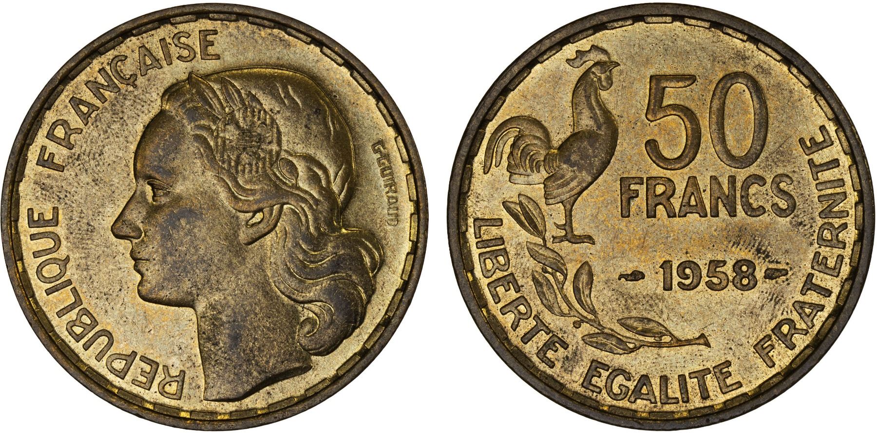 FRANCE: Republic, 50 francs, 1958, KM-918.1, light fingermarks, key date, Unc, ex Almer H. Orr III Collection.