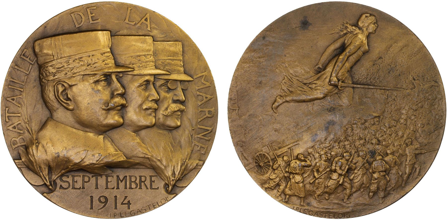 FRANCE: Republic, AE medal (142.6g), 1914, Maier-231, 68mm bronze medal for the Battle of the Marne by J. P. Legastelois, conjoined busts right of Joffre, Maunoury, and Gallieni with BATAILLE - DE LA - MARNE around and "(incuse) SEPTEMBRE / 1914" around // Marianne flying right above battalion of soldiers while holding sword, a few small spots on reverse, BRONZE and cornucopia privy mark on edge, Choice AU.