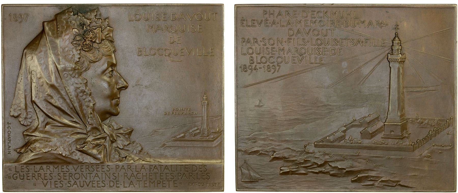 FRANCE: Republic, AE plaque (99.54g), 1897, 61x71mm bronze plaque on Louise Davout and the Eckmühl Lighthouse by Jules-Clement Chaplain, veiled bust of Louise Davout with "1897" at upper left, LOUISE DAVOUT / MARQUISE / DE / BLOCQUEVILLE at upper right, lighthouse with POINTE / DE PENMARCH at lower right, and "LES LARMES VERSEES PAR LA FATALITE DES / "GUERRES SERONT AINSI RACHETEES PAR LES / " VIES SAUBEES DE LA TEMPETE" EXT.DU.TESTt in exergue // view of lighthouse on Point Penmarch in memory of Marshal Davout, Louise's father, the victor at Eckmühl during the Napoleonic Wars, with "PHARE D'ECKMUHL / ÈLEVÉ A LA MEMOIRE DU MARal / DAVOUT / PAR SON FILS LOUIS ET SA FILLE / LOUISE MARQUISE DE / BLOCQUEVILLE / 1894-1897" at upper right, slight oxidation at top of portrait, otherwise beautiful brown surfaces, BRONZE and cornucopia privy mark on edge, Unc.