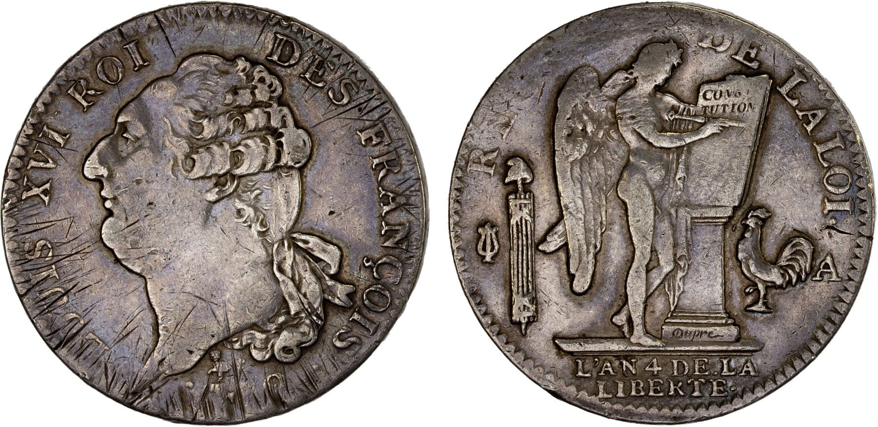FRANCE: Republic, AR ecu (6 livres), 1792-A, KM-615.1, reverse legend not fully struck up, due to marginal adjustments on obverse, a couple small reverse scratches, two-year type, VF.