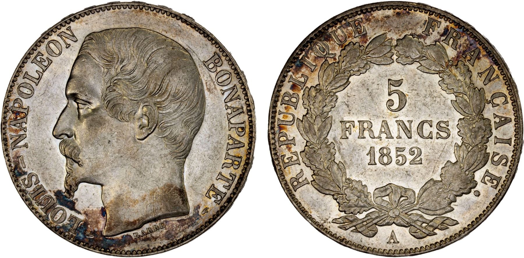 FRANCE: Second Republic, AR 5 francs, 1852-A, KM-773.1, one-year type, light cleaning and small marks, Choice AU. Issued in the final year of the Second Republic, this type bears the portrait and the name of President Louis-Napoleon Bonaparte, who would abolish the republic and proclaim himself emperor in December of 1852.