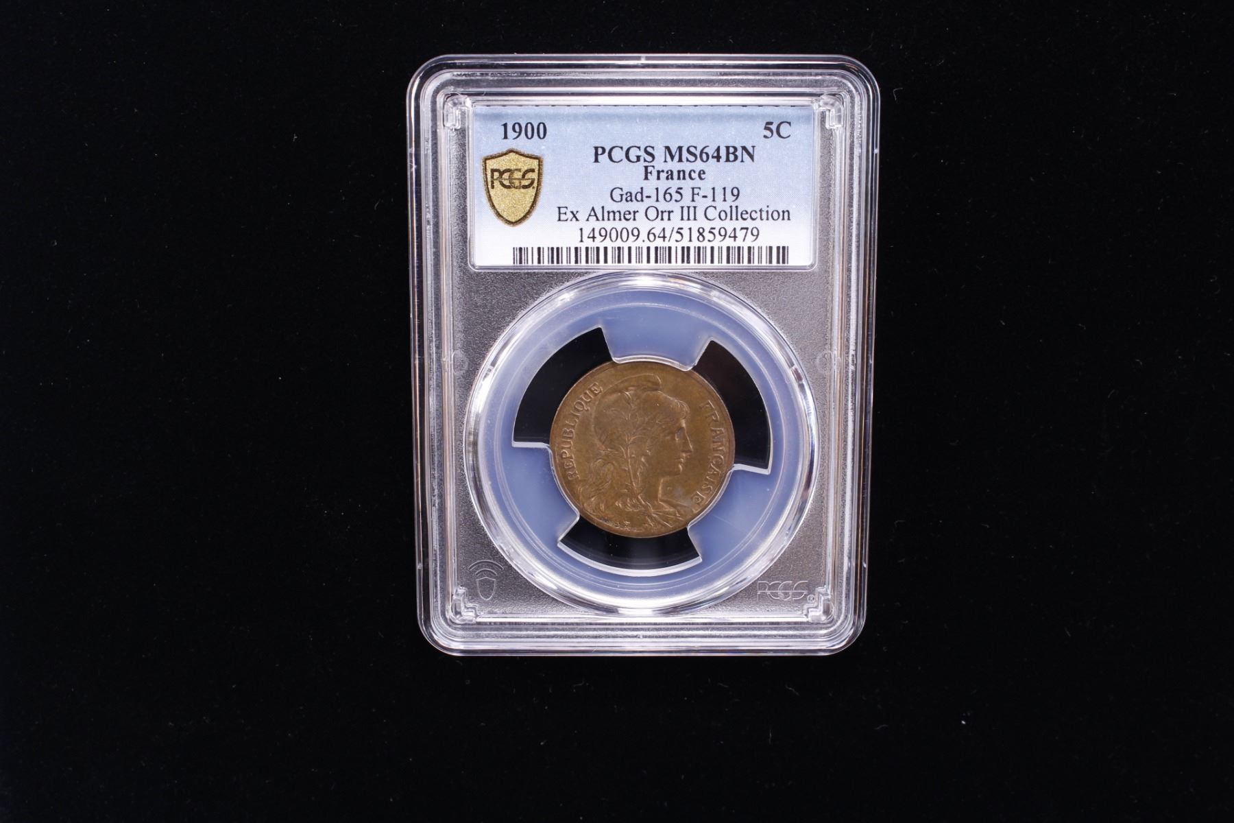 FRANCE: Third Republic, AE 5 centimes, 1900, KM-842, Y-60, a wonderful example, PCGS graded MS64 BN, ex Almer H. Orr III Collection.