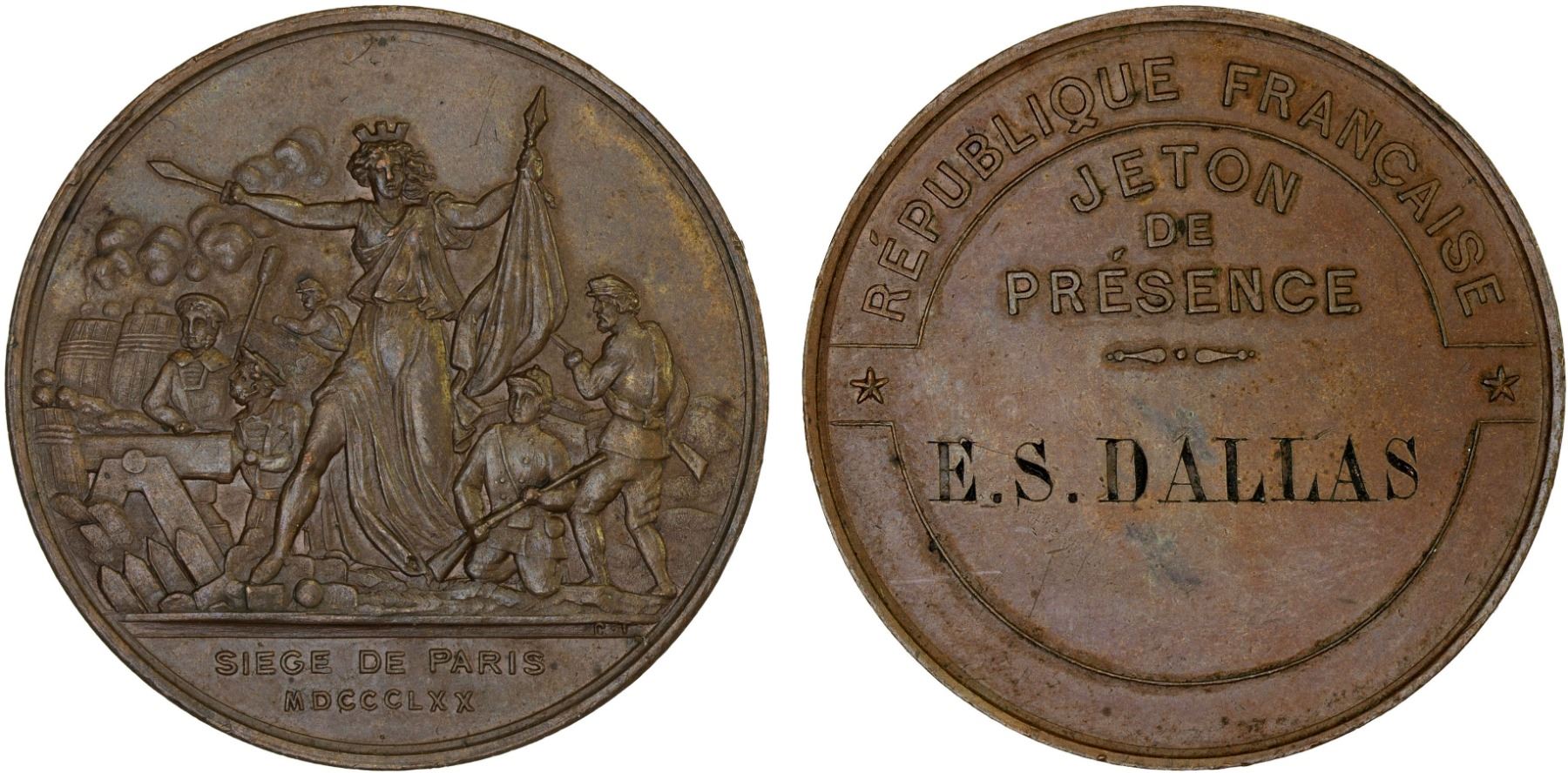 FRANCE: Third Republic, AE medal, 34mm jeton de présence for individuals in Paris during the 1870 siege by Prussia, personification of Paris urging soldiers forward at barricades, SIÈGE DE PARIS / MDCCCLXX in exergue // reverse engraved E. S. Dallas (Scottish journalist), attractive light luster, Almost Unc to Unc.