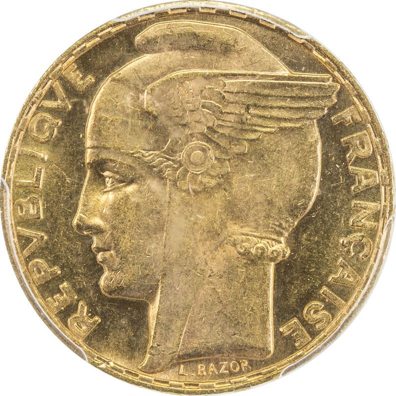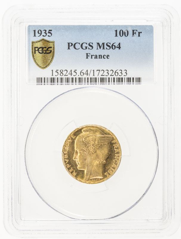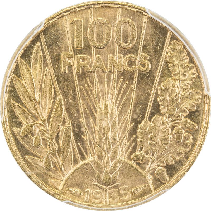 FRANCE: Third Republic, AV 100 francs, 1935, KM-880, classic art deco design, semi-prooflike, PCGS graded MS64 Secure Holder.