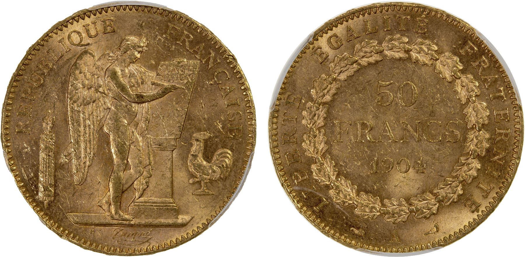 FRANCE: Third Republic, AV 50 francs, 1904-A, KM-831, Gad-1113, F-549, a lovely lustrous example! PCGS graded MS63. The unique "Génie ailé (Winged genius)" design was created in 1792 by Augustine Dupré. After the original appearance in 1792, this type was produced again in 1871. After that, the colloquially named "French Angel" was issued intermittently until 1898. The design was also used on coins in 1848 and 1849, and again from 1899 to 1906. Some refer to the coin as the "Lucky Angel" due to the unlikely escape from the guillotine by Dupré supposedly using a coin of this type as a bribe to a guard.