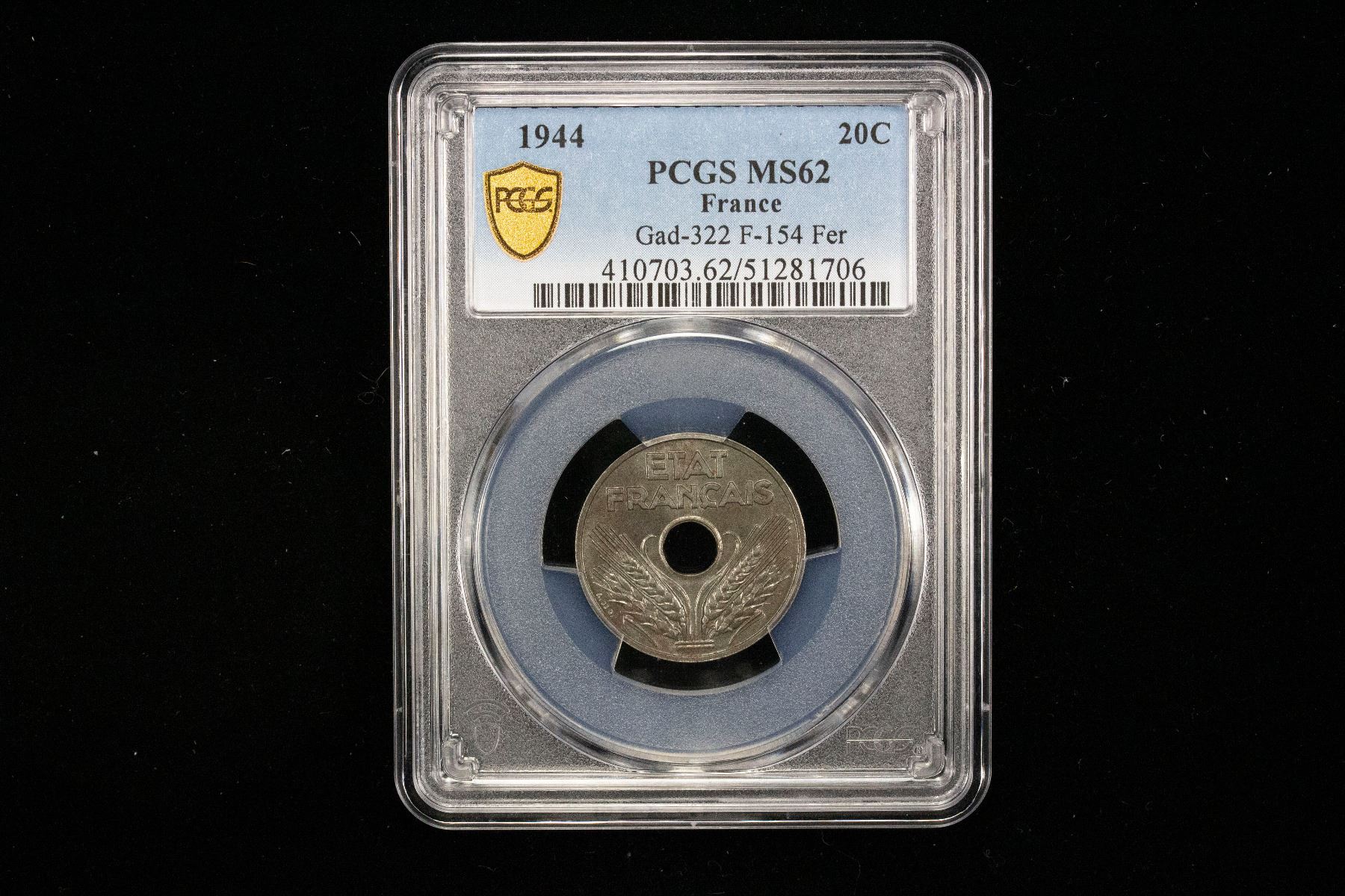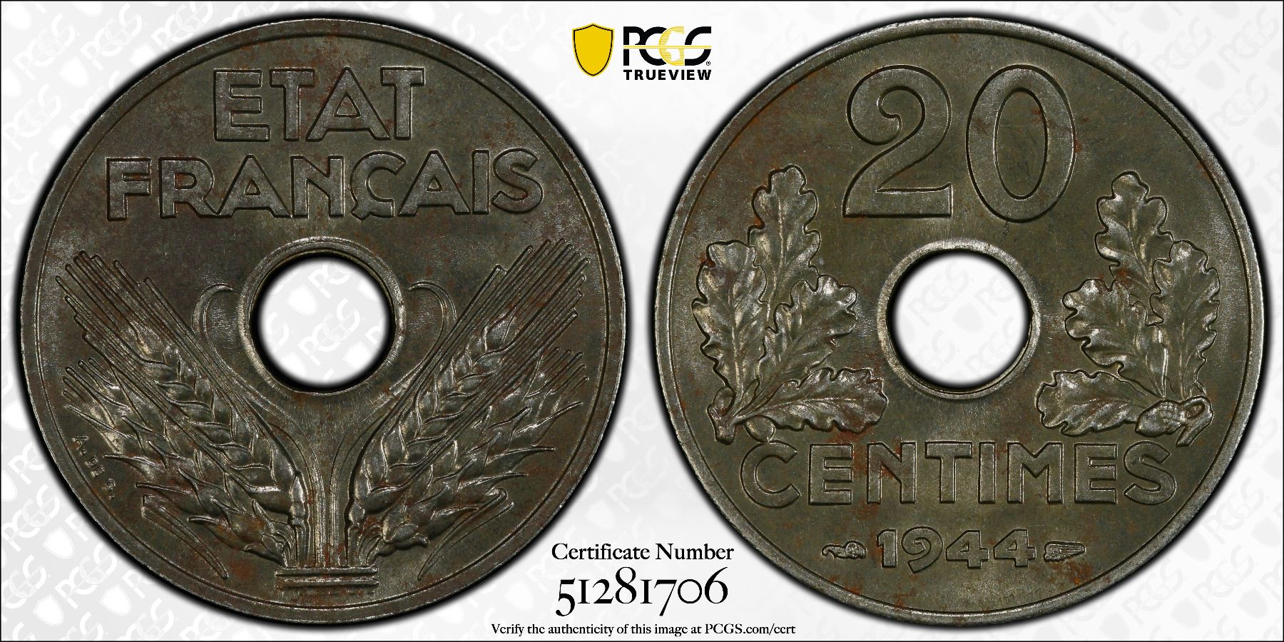 FRANCE: Vichy French State, 20 centaimes, 1944, KM-900.2a, Gad-322, F-154, a pleasing mint state example of this rare date! PCGS graded MS62.
