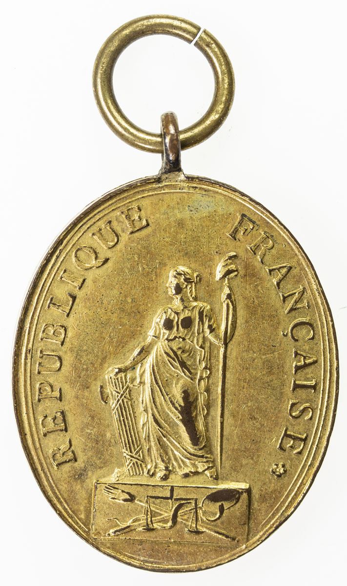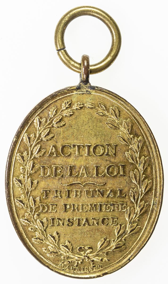 FRANCE: gilt bronze oval badge medal (21.74g), ND (circa 1800), 32x44mm, by J. M. Maurisset; REPUBLIQUE FRANÇAISE around figure of Liberty with fasces holding staff topped with revolutionary bonnet. She stands on a plinth depicting the hand and scales of justice, a mirror and a serpent // ACTION DE LA LOI, TRIBUNAL DE PREMIERE INSTANCE, with loop, AU.