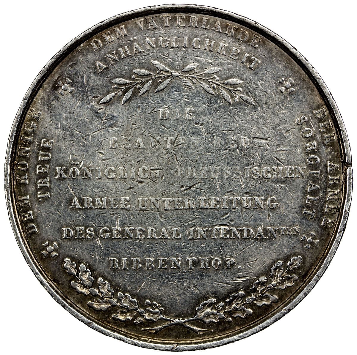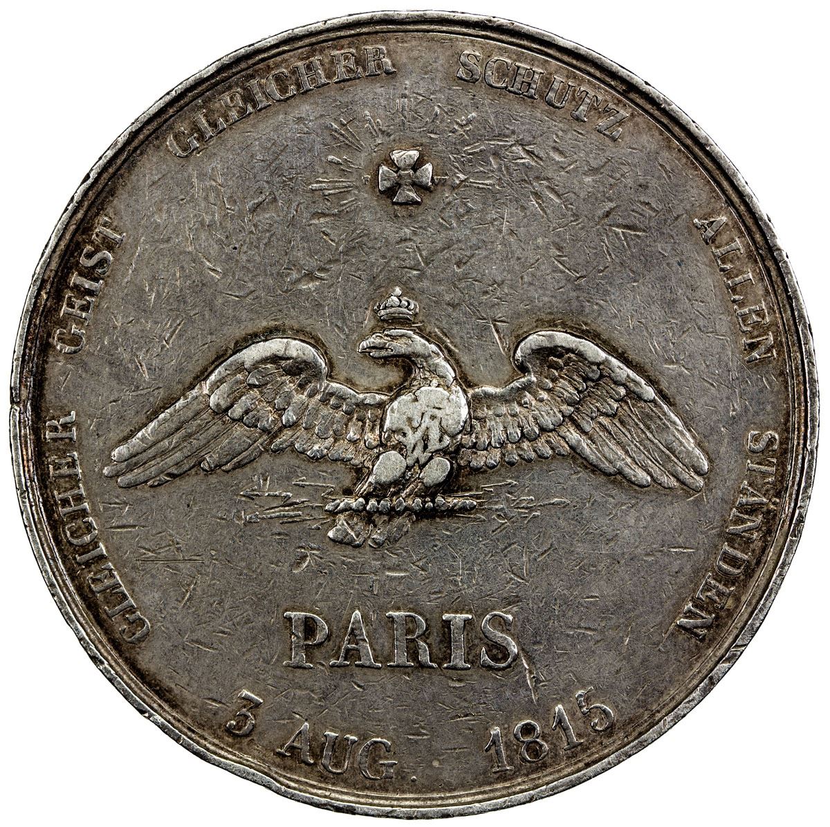 FRANCE: medallic AR 5 francs, 1815, Bramsen-1706, Julius-3447, 38mm, Prussian eagle, GLEICHER GEIST GLEICHER SCHUTZ ALLEN STANDEN above, PARIS 3 AUG 1815 below // DEM KöNIGE TREUE / DEM VATERLANDE ANHÀNGLICHKEIT / DER ARMEE SORGFALT, in outer field with each motto in two lines, laurel branch below, DIE / BEAMTEN DER / KöNIGLICH PREUSSISCHEN / ARMEE UNTERLEITUNG / DES GENERAL INTENDANTEN / RIBBENTROP at center, oak branches below, Fine to VF.   This medal was offered by Prussian army officials under the command of General Ribbentrop, in honor of King Frederick William III, on his birthday. On the edge are engraved the names of the principal leaders of the Prussian army: BLÜCHER / SCHARNHORST / GNEISENAU / HARDENBERG.