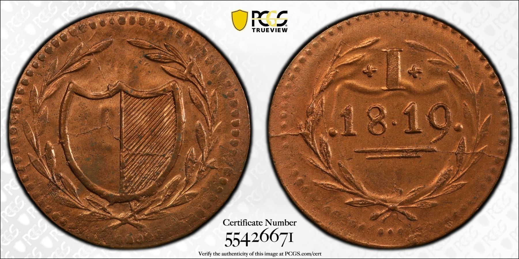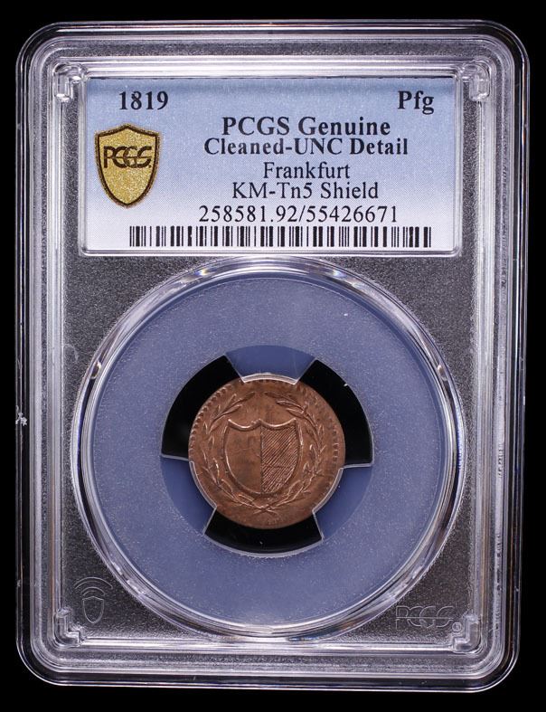 FRANKFURT: AE pfennig, 1819, KM-Tn5, also called a "Judenpfennig", once cleaned, PCGS graded UNC details.