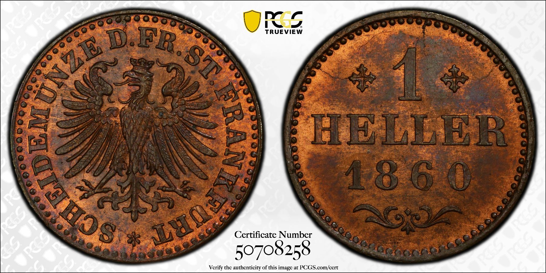 FRANKFURT AM MAIN: Free City, AE heller, 1860, KM-356, Cr-5, a wonderful mint state example! PCGS graded MS64 RB, ex Joe Sedillot Collection.