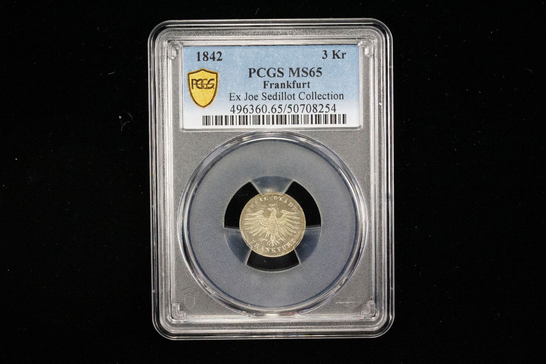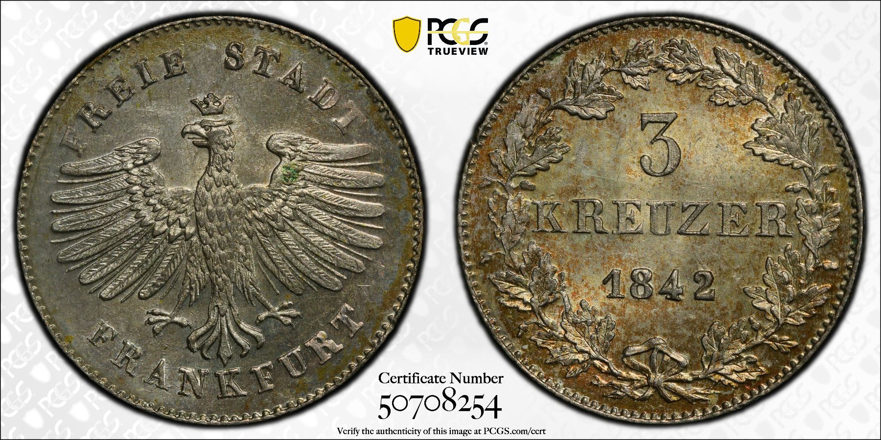FRANKFURT AM MAIN: Free City, AR 3 kreuzer, 1842, KM-313, Cr-29, a superb mint state example! PCGS graded MS65, ex Joe Sedillot Collection.