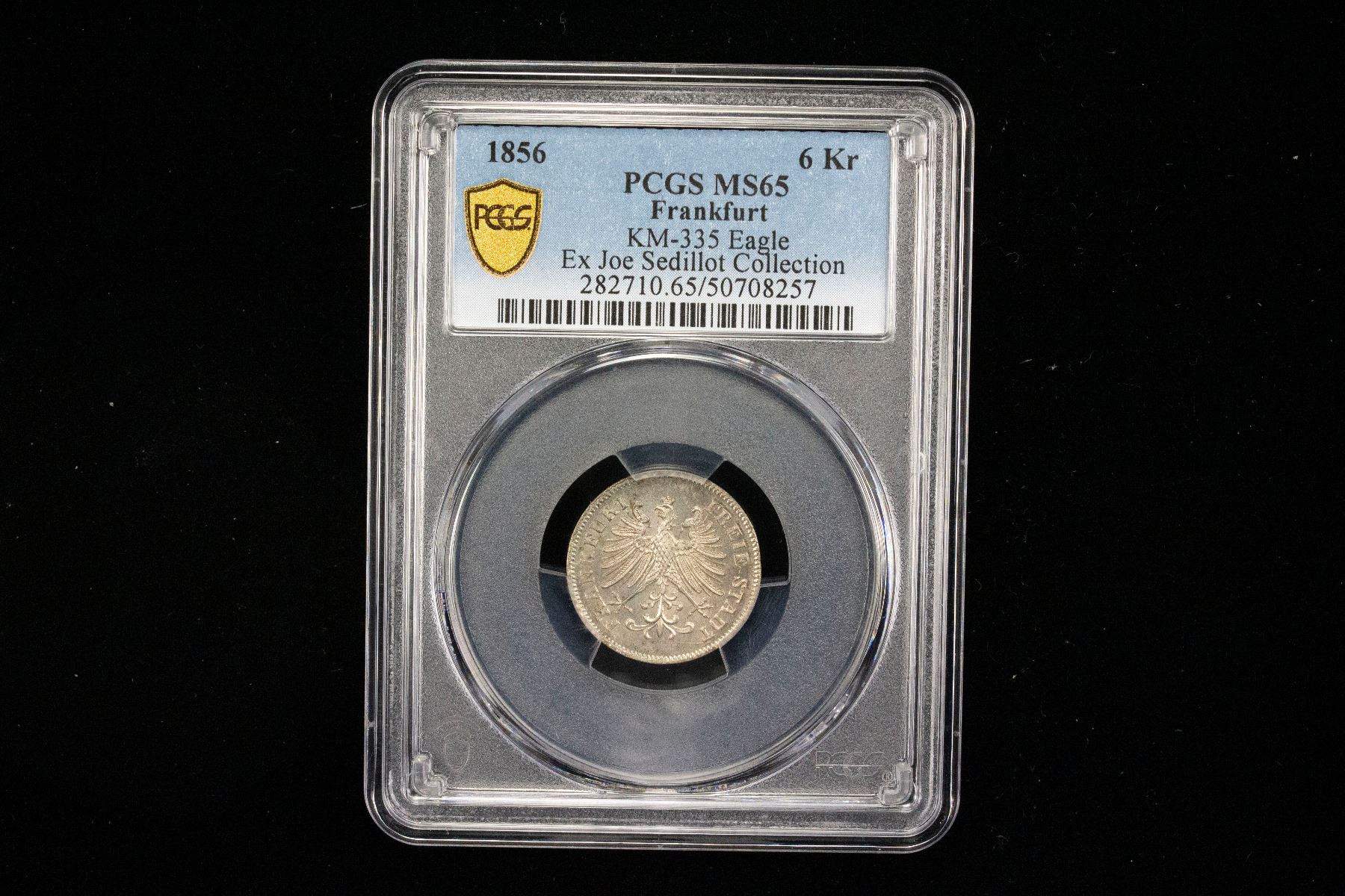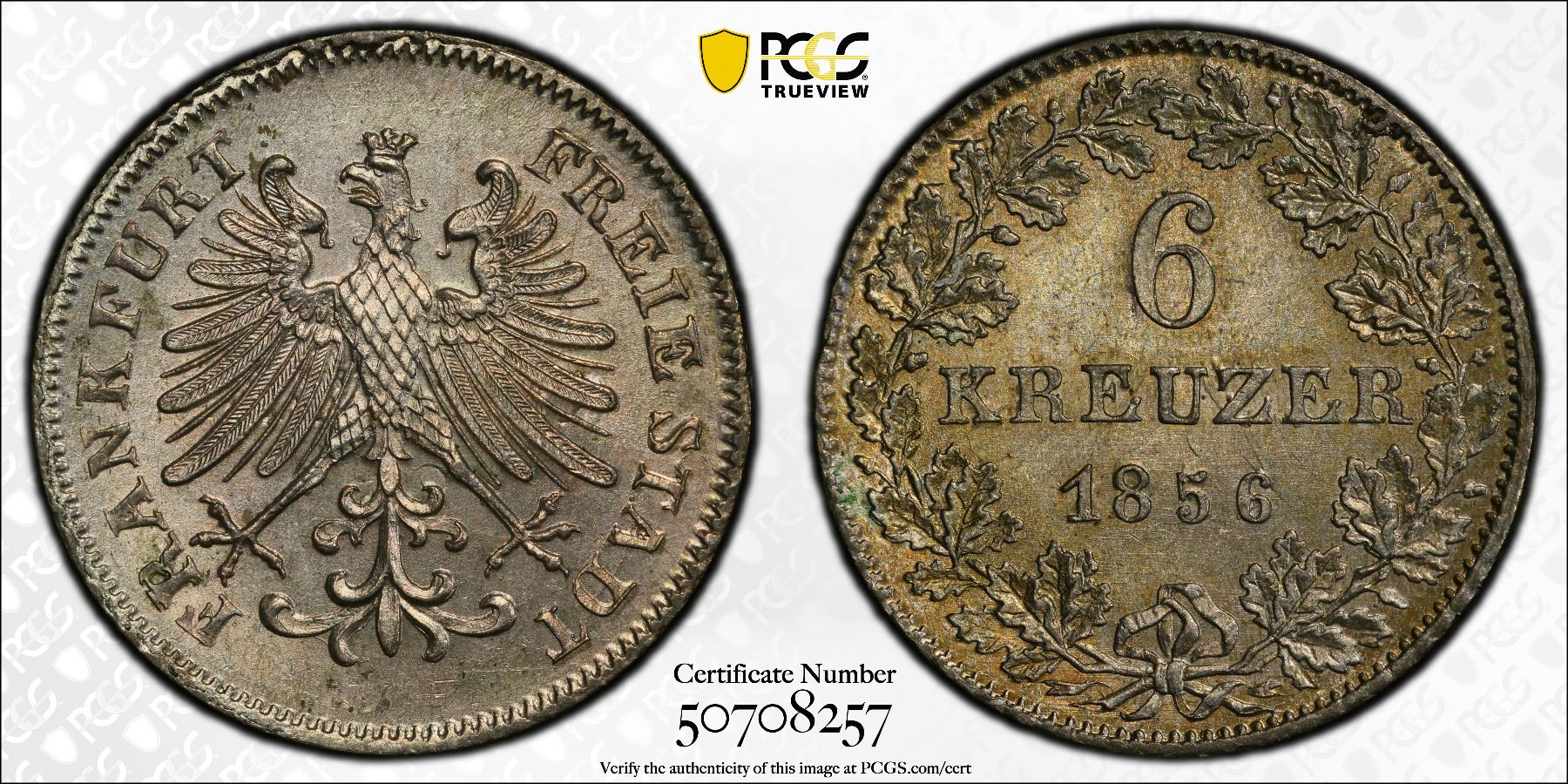 FRANKFURT AM MAIN: Free City, AR 6 kreuzer, 1856, KM-335, Cr-37a, a superb mint state example! PCGS graded MS65, ex Joe Sedillot Collection.