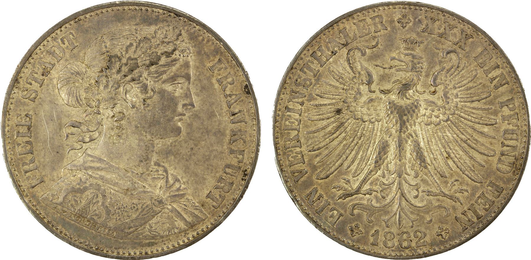 FRANKFURT AM MAIN: Free City, AR thaler (vereinsthaler), 1862, KM-370, toned, XF-AU, ex Almer H. Orr III Collection.