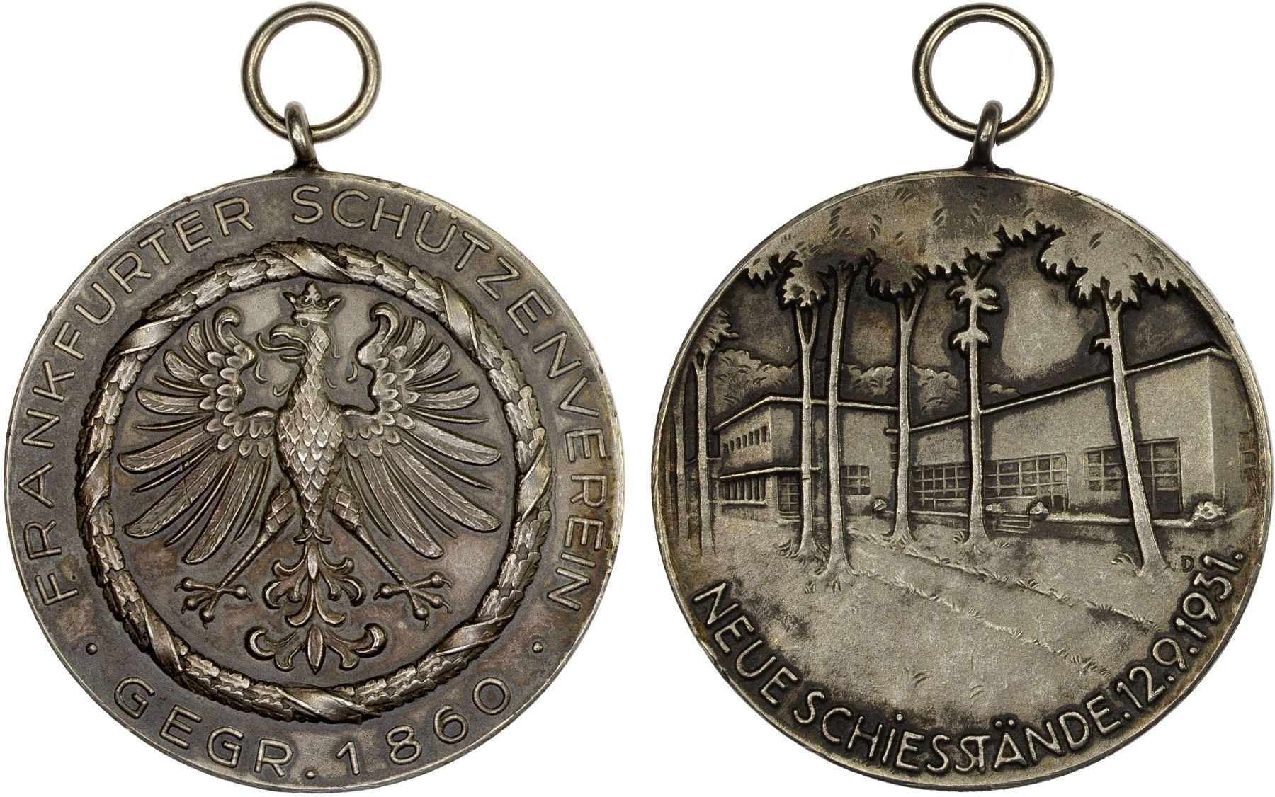 FRANKFURT: AR medal (22.51g), 1931, 40mm silver medal for the New Shooting Ranges of the Schützenverein by D. for Wiedmann, crowned Frankfurt eagle with oak wreath around and "FRANKFURTER SCHÜTZENVEREIN - GEGR. 1860" around // three-quarter view of buliding facade with trees in foreground with "NEUE SCHIESSTÄNDE.12.9.1931." below, lightly cleaned obverse, toned reverse, matte finish, with loop and ring for suspension, rare, "WIEDMANN - 900" on edge, AU.