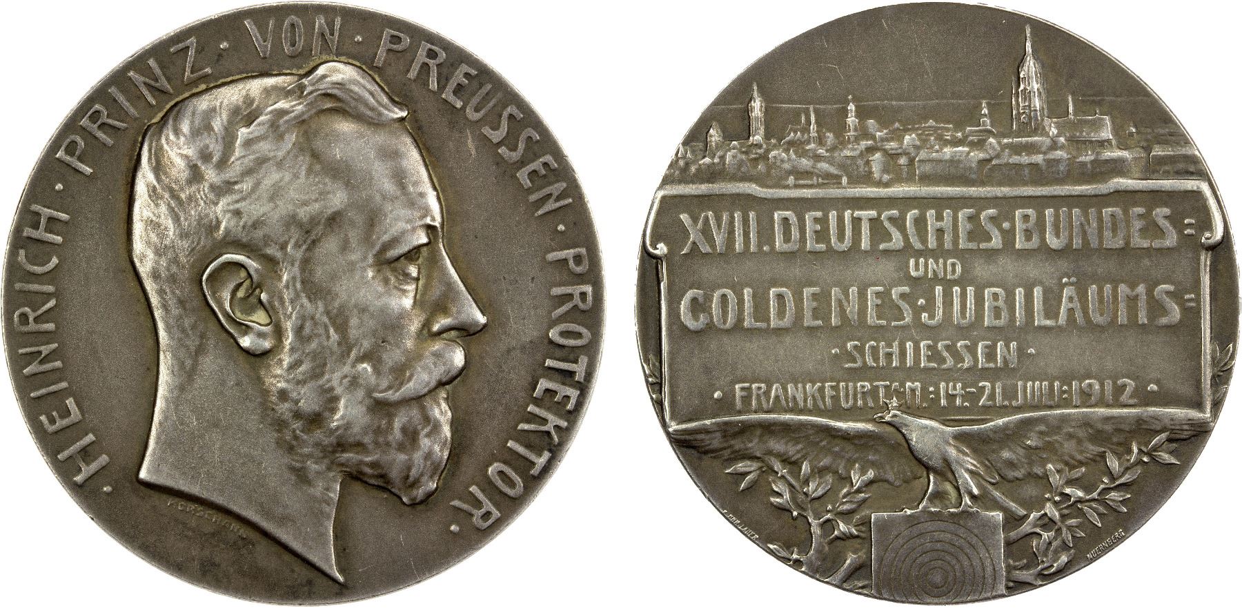 FRANKFURT: AR medal (25.46g), 1912, Steulmann-3, Peltzer Coll.-1154, 40mm silver award medal for the 17th German Federal Shooting Festival by Korschann for Lauer, Nuremberg, cartouche inscribed with XVII.DEUTSCHES BUNDES= / UND / GOLDENES JUBILÄUMS= / SCHIESSEN / FRNAKFURTa.M.:14.-21.JULI:1912 with eagle with outstreched wings on target below and city view above // bust left with HEINRICH PRINZ VON PREUSSEN PROTEKTOR around, matte finish, attractive original tone, SILBER 990 on edge, XF to AU.
