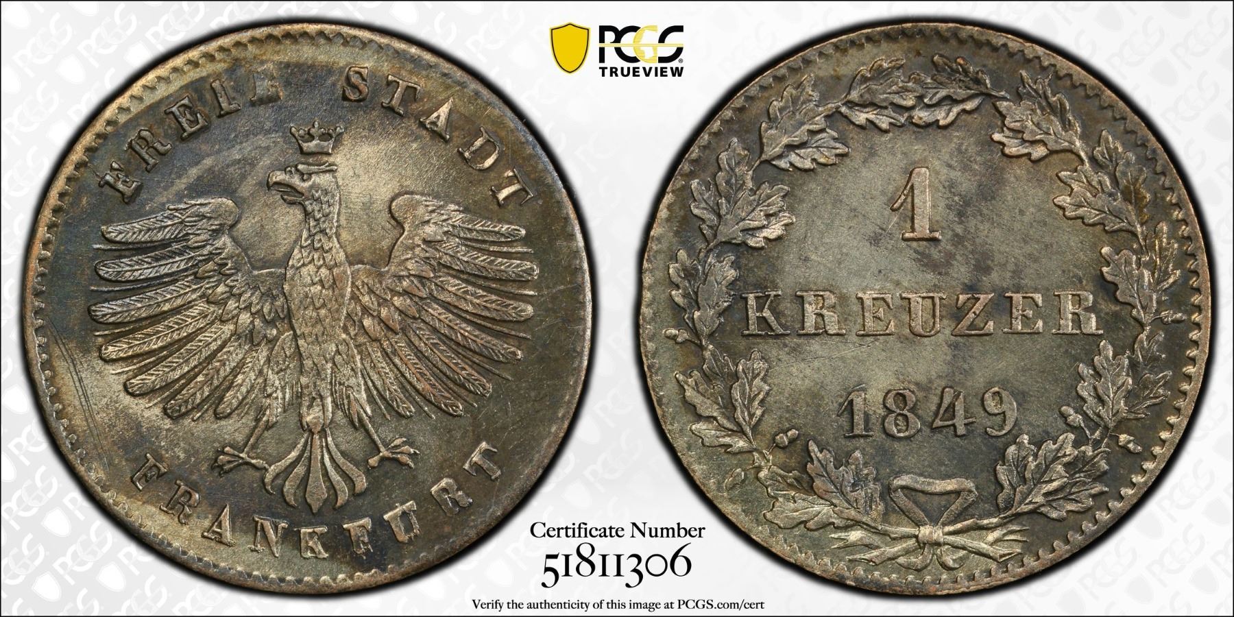 FRANKFURT: Free City, AR kreuzer, 1849, PCGS MS64