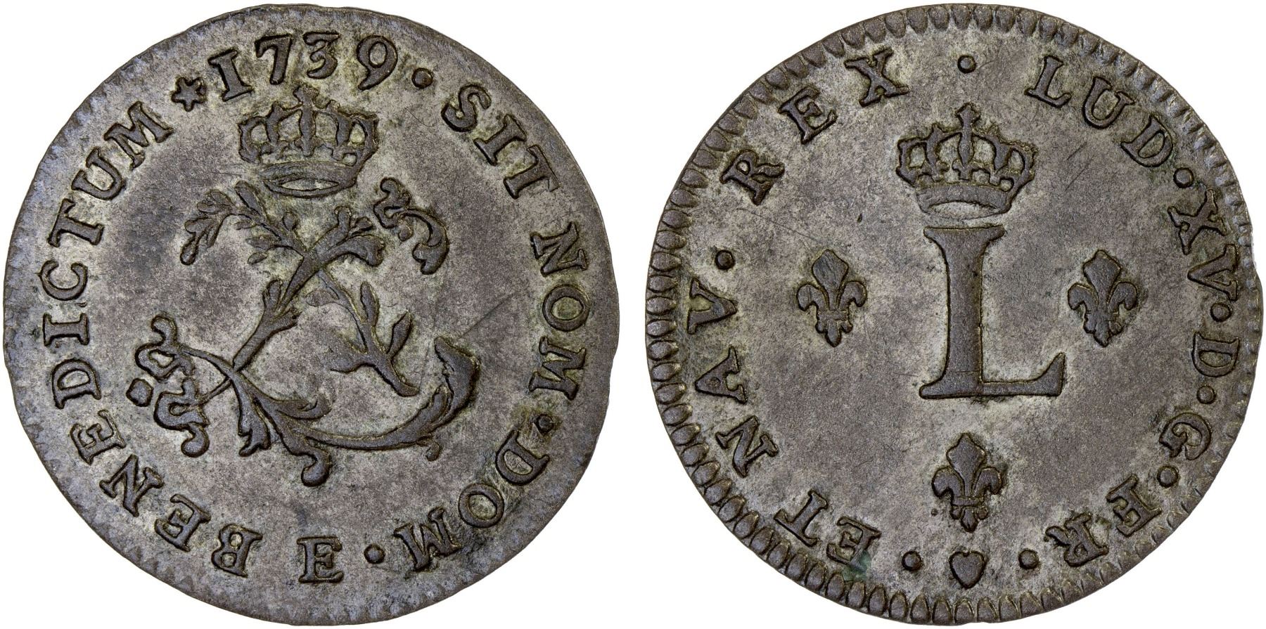 FRENCH COLONIES (CANADA): Louis XV, 1715-1774, BI 2 sols (sou marque) (2.05g), Tours, 1739-E, KM-500.7 (France), Vlack-77, well struck and reasonably well centered, XF, ex Al Boulanger, ex Vlack Collection. This is the Vlack plate coin.