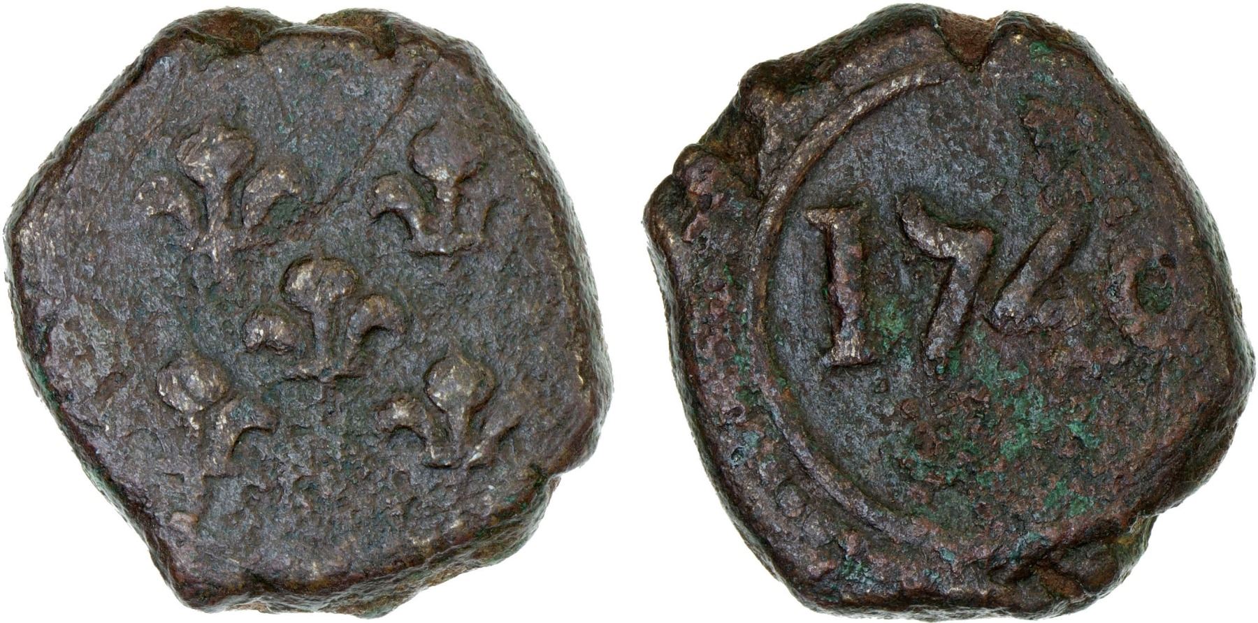FRENCH INDIA: AE biche (6.02g), 1740, KM-65, 5 fleur-de-lis // date in circle; struck at the Mahé Mint, VF, R.
