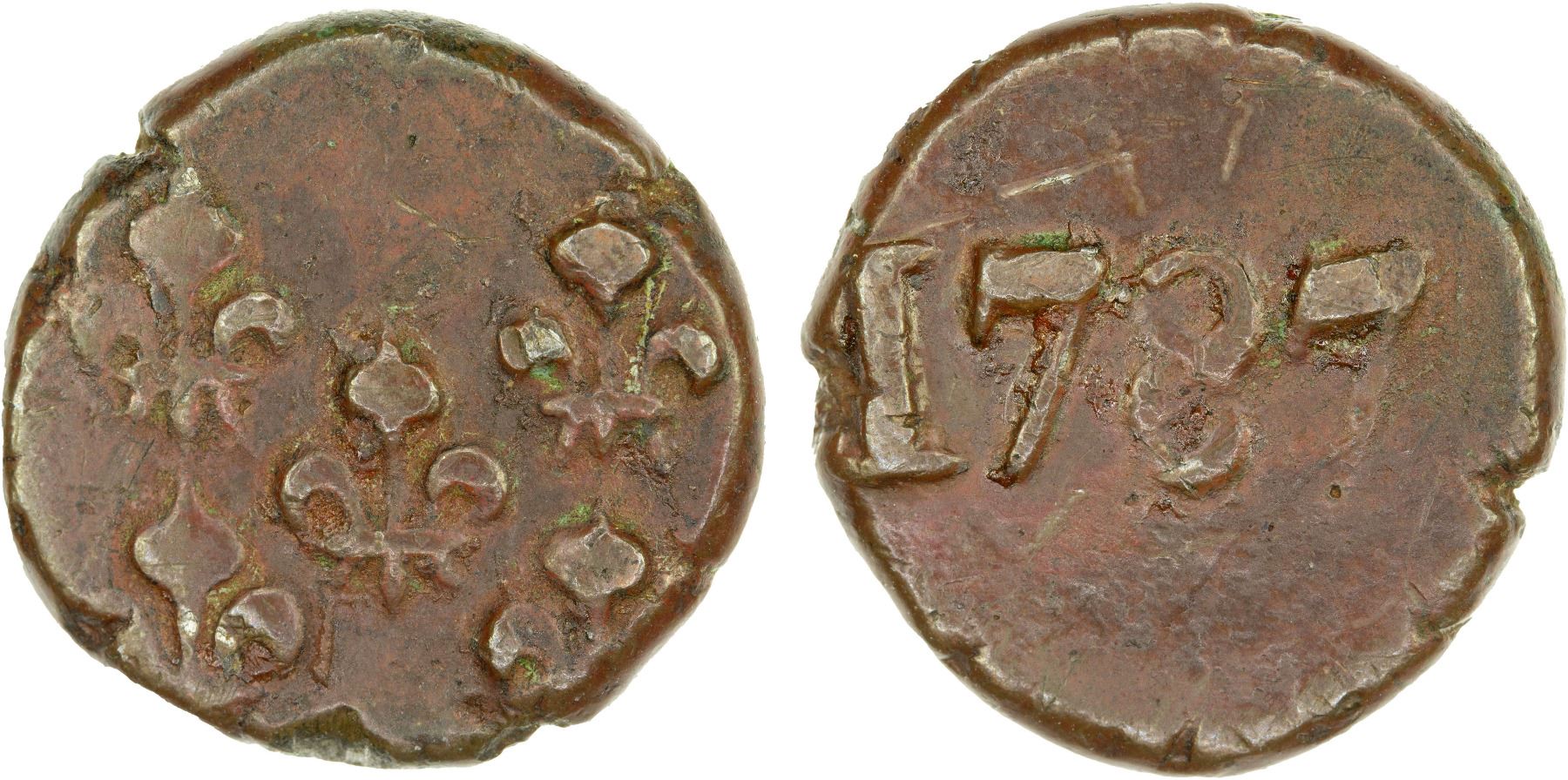 FRENCH INDIA: AE biche (7.12g), Mahé, 1787, KM-65, Lec-60, 5 fleurs-de-lis // date, pleasing example, bold VF, R.