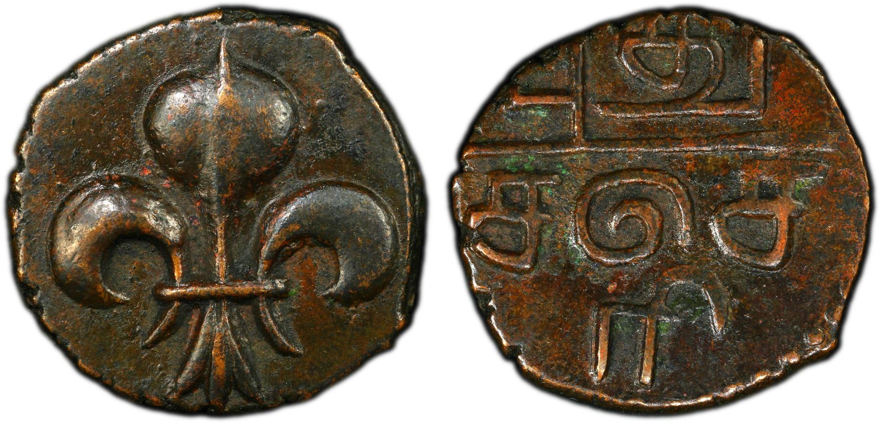 FRENCH INDIA: AE doudou (3.66g), Pondichéry, ND, KM-35, Lec-20, fleur-de-lis // Tamil legend, struck circa 1715-74, PCGS graded AU53. The sole highest graded example (Top Pop) at PCGS.