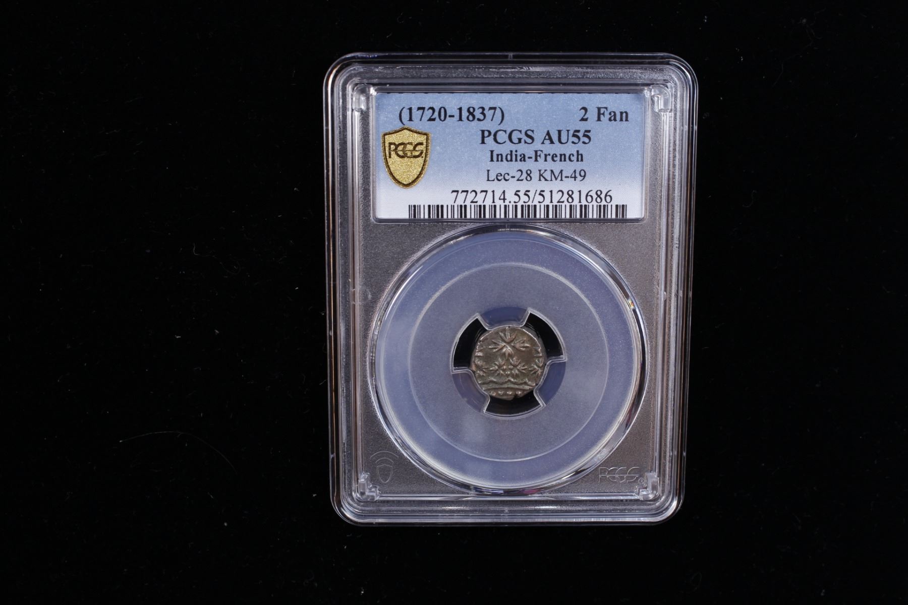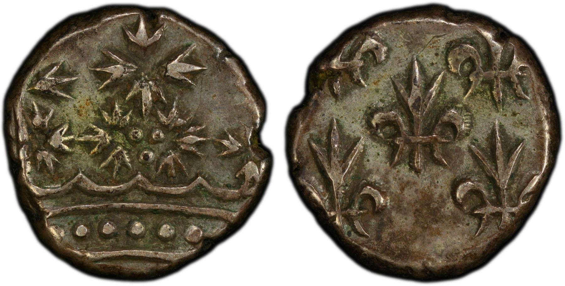 FRENCH INDIA: AR double fanon (2.89g), Pondichery, ND, KM-49, Lec-28, crown // 5 fleurs-de-lis, struck circa 1720-1837, well-centered crown, PCGS graded AU55.