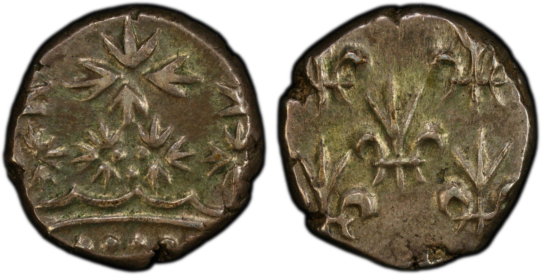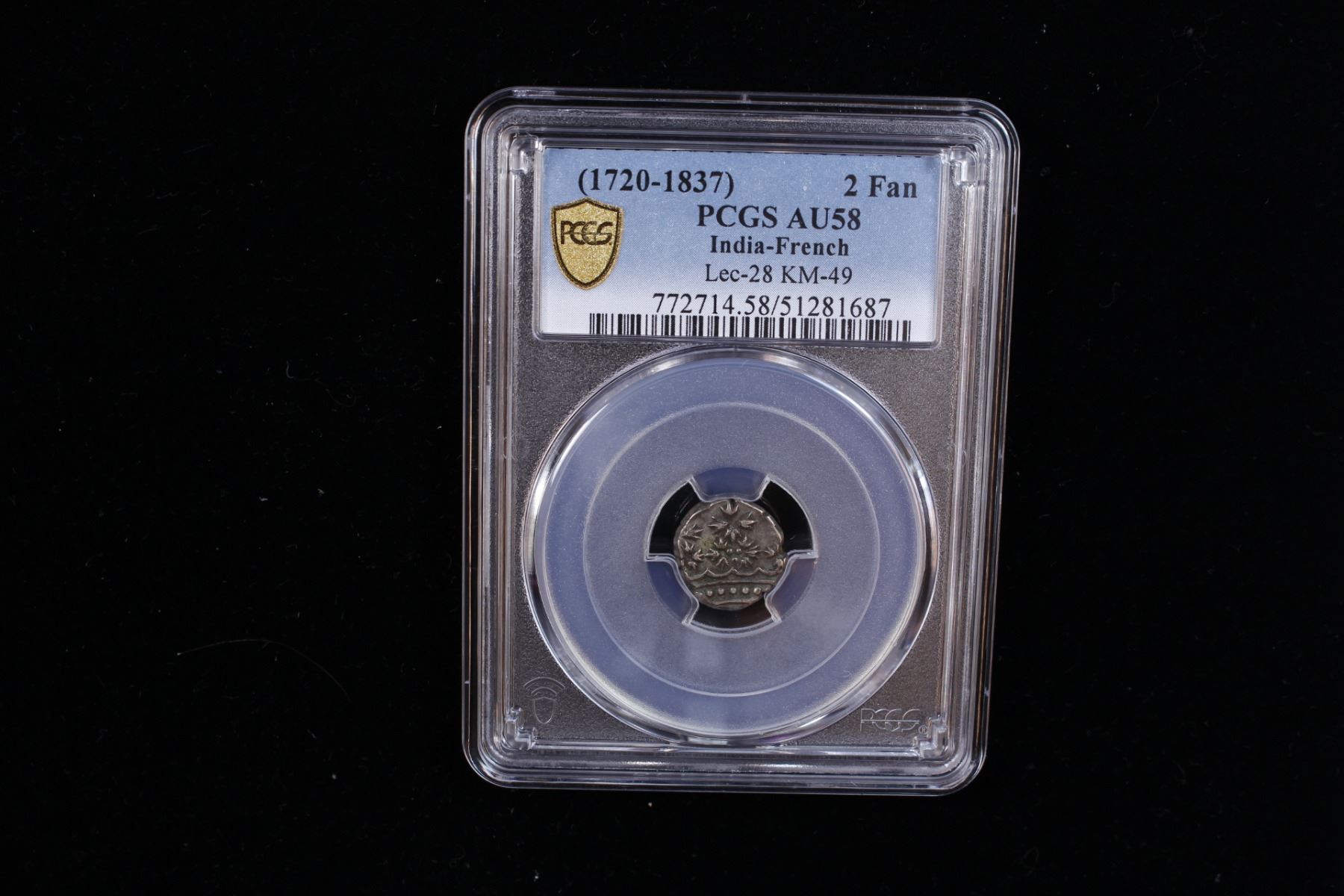 FRENCH INDIA: AR double fanon (2.91g), Pondichery, ND, KM-49, Lec-28, crown // 5 fleurs-de-lis, struck circa 1720-1837, well-centered crown, an attractive nearly mint state example, PCGS graded AU58.