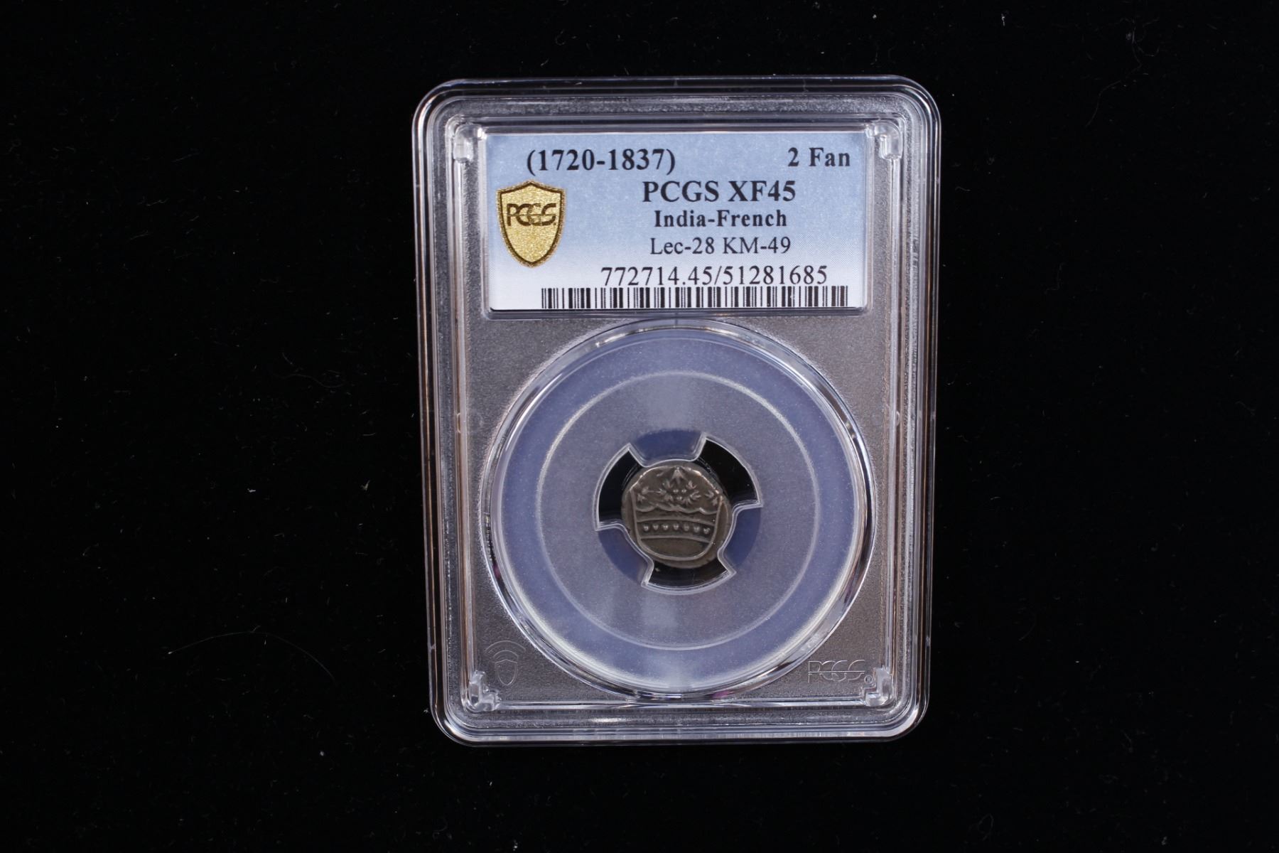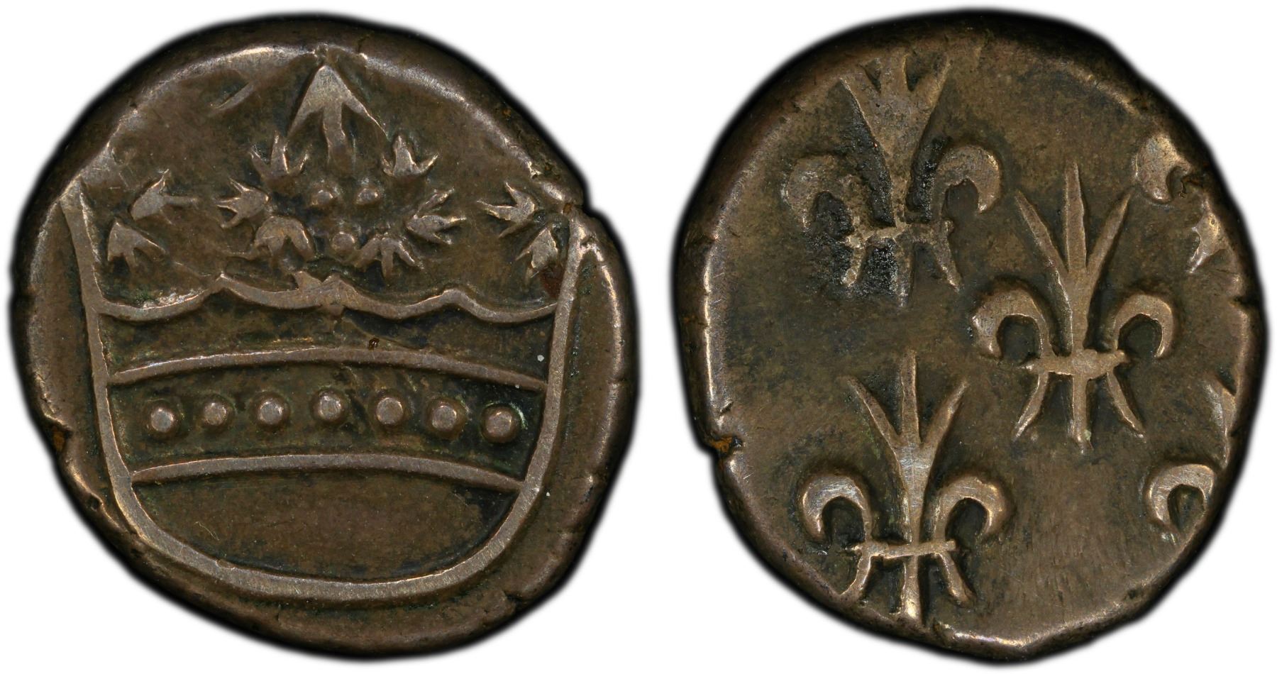 FRENCH INDIA: AR double fanon (2.96g), Pondichéry, ND, KM-49, Lec-28, crown // 5 fleurs-de-lis, struck circa 1720-1837, well-centered crown, PCGS graded EF45.