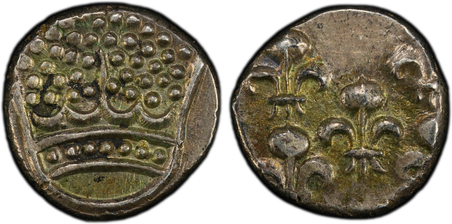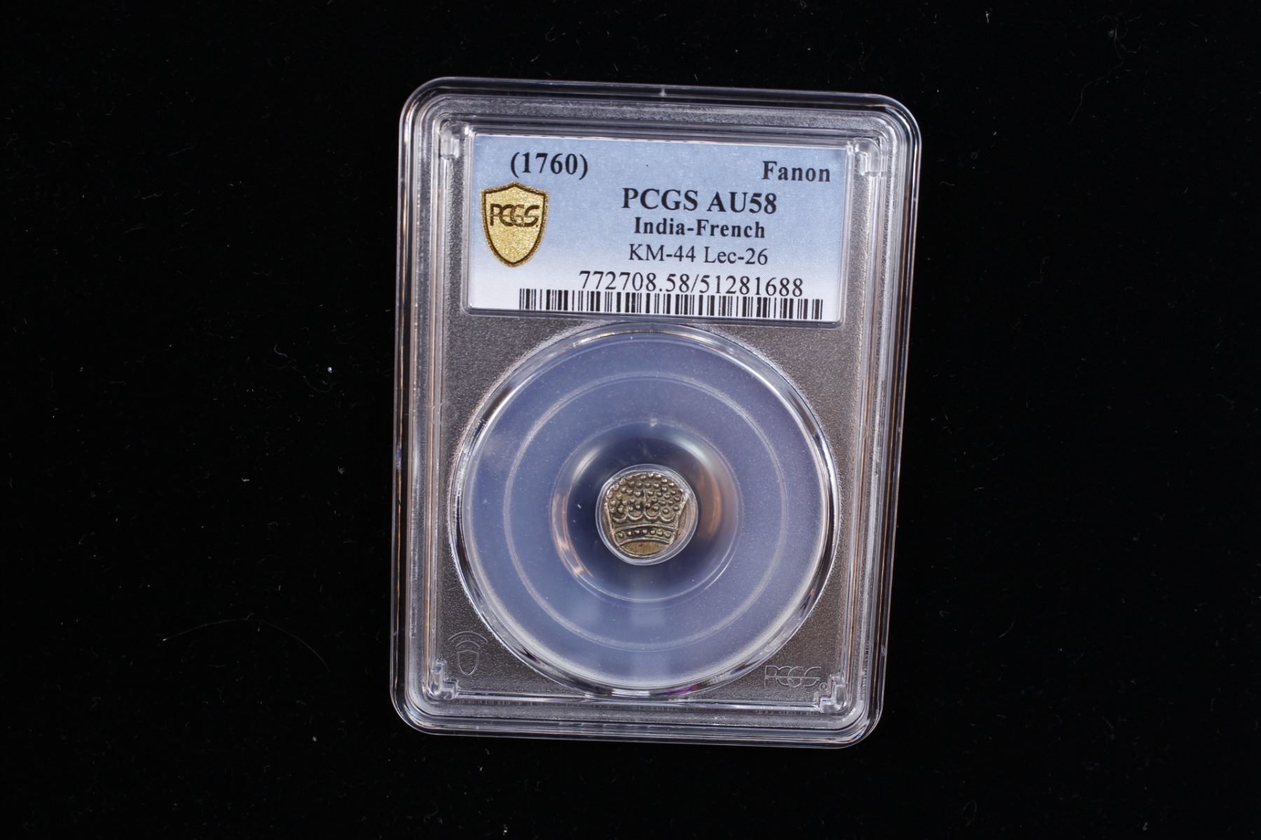 FRENCH INDIA: AR fanon (1.56g), Pondichery, ND, KM-44, Lec-26, crown // 5 fleurs-de-lis, struck circa 1760, well-centered crown, an attractive nearly mint state example, PCGS graded AU58. The sole highest graded example (Top Pop) at PCGS.