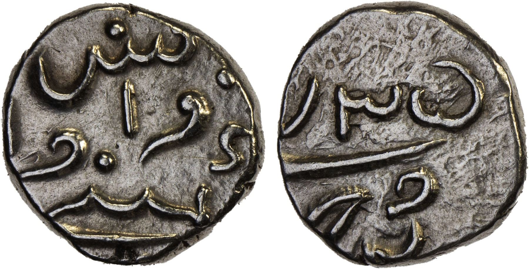 FRENCH INDIA: AR fanon (2.28g), Pondichéry, 1735, KM-66, Lec-65, issue of the French East India Company for the city of Mahé, struck during the reign of Louis XV (1715-1774); better date, choice AU.