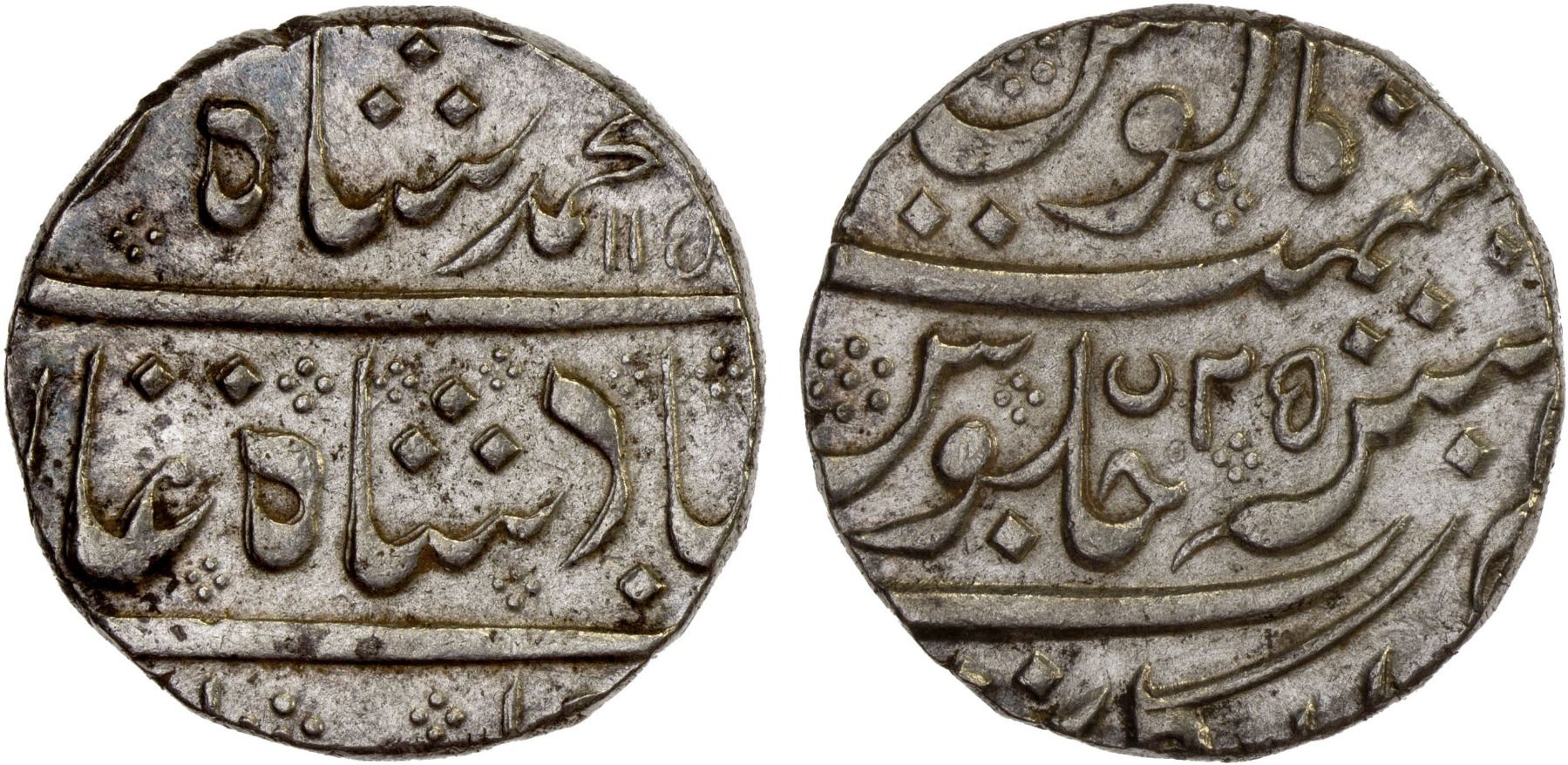 FRENCH INDIA: AR rupee (11.31g), Arkat, AH115x year 25, KM-5, in the name of Muhammad Shah, with crescent privy mark, lustrous, AU.