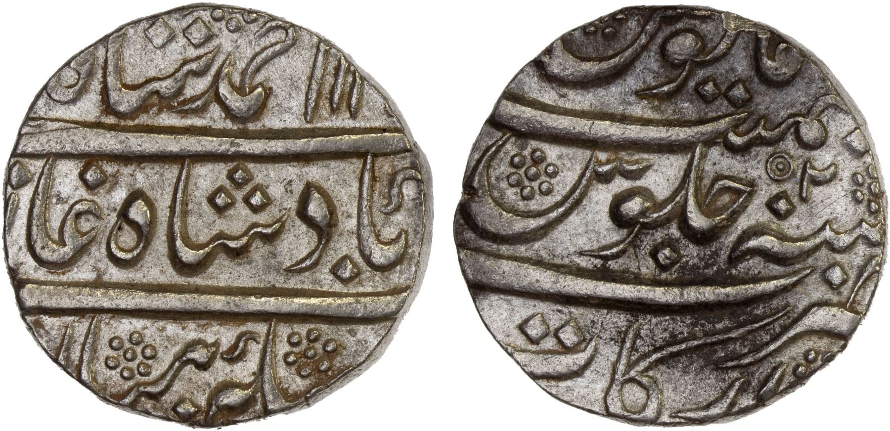 FRENCH INDIA: AR rupee (11.41g), Arkat, year 2, KM-5, in the name of Muhammad Shah, with interesting dot within circle privy mark, lustrous, AU.
