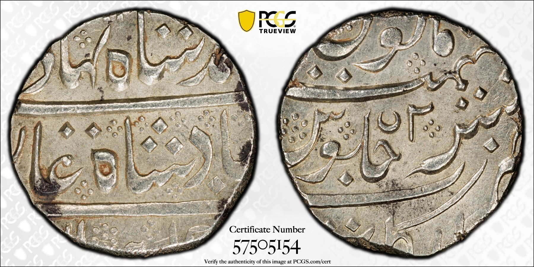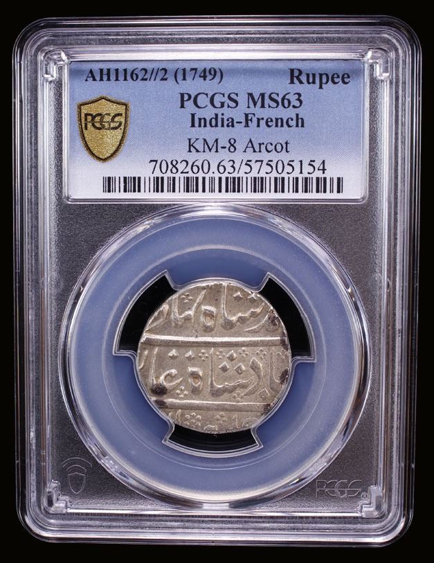 FRENCH INDIA: AR rupee (11.45g), Arkat, year 2, KM-8, Lec-99, struck in the name of Ahmad Shah Bahadur, attractive satiny luster, PCGS graded MS63.