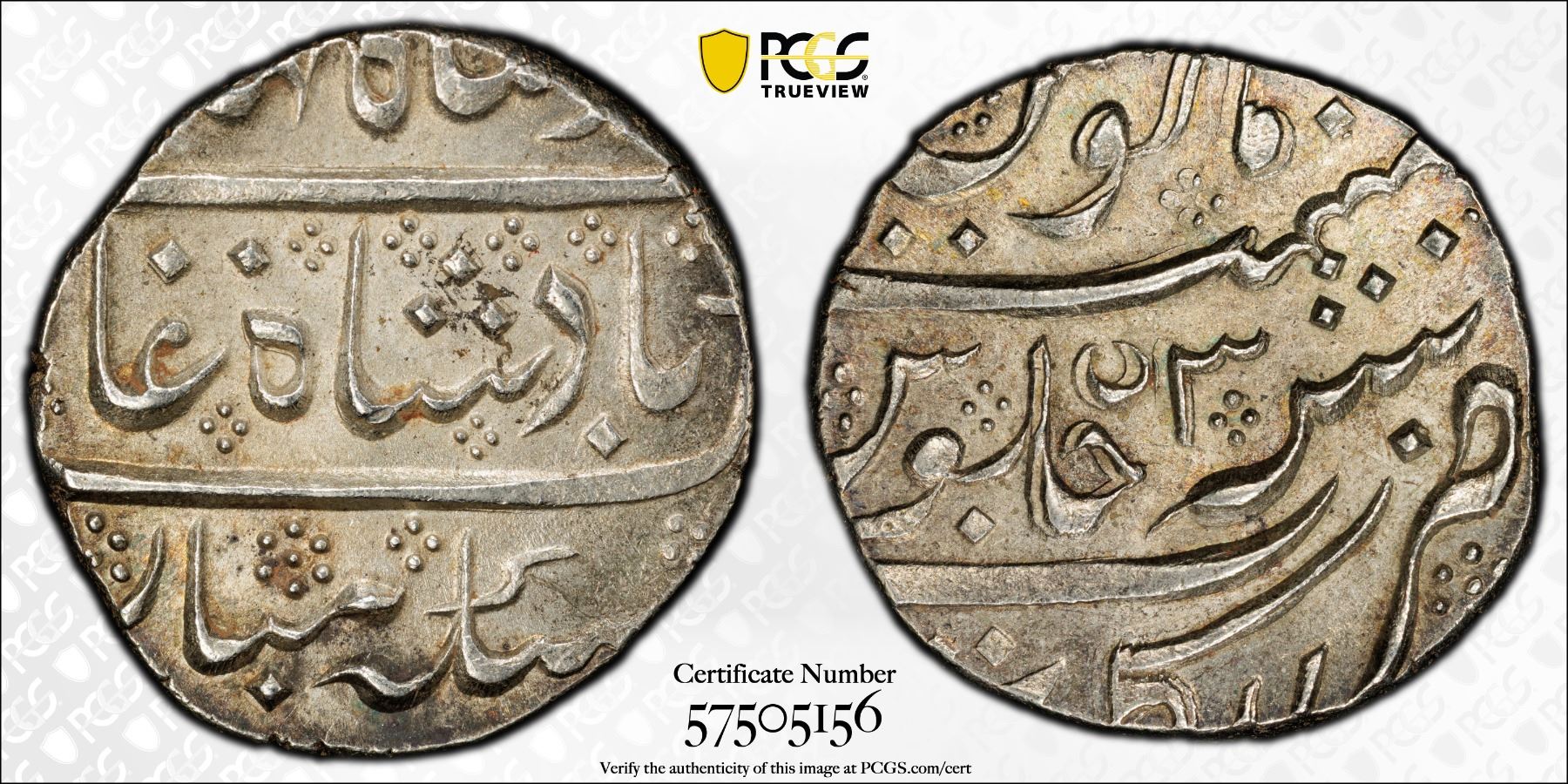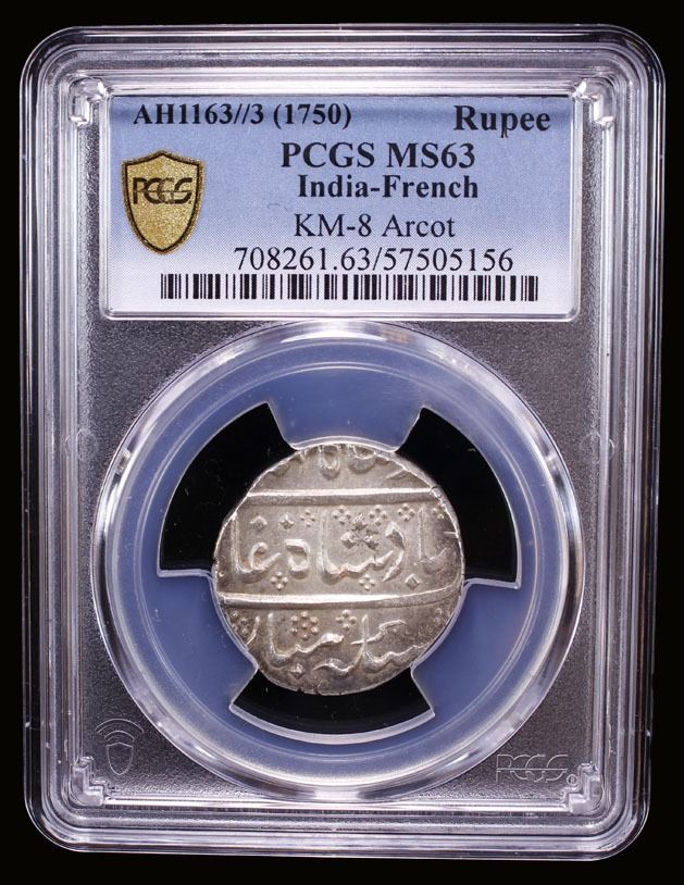 FRENCH INDIA: AR rupee (11.46g), Arkat, year 3, KM-8, Lec-99, struck in the name of Ahmad Shah Bahadur, beautiful light luster with subtle smoky toning, PCGS graded MS63.