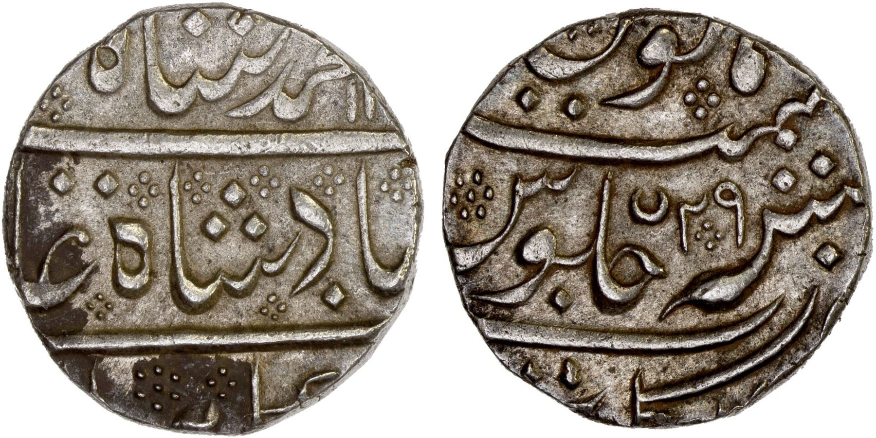 FRENCH INDIA: AR rupee (11.47g), Arkat, year 29, KM-5, in the name of Muhammad Shah, minor adhesions, XF.
