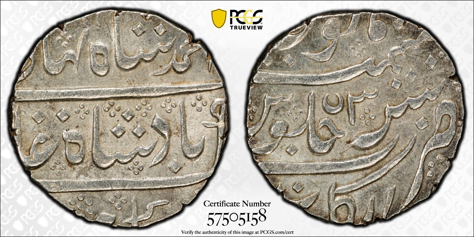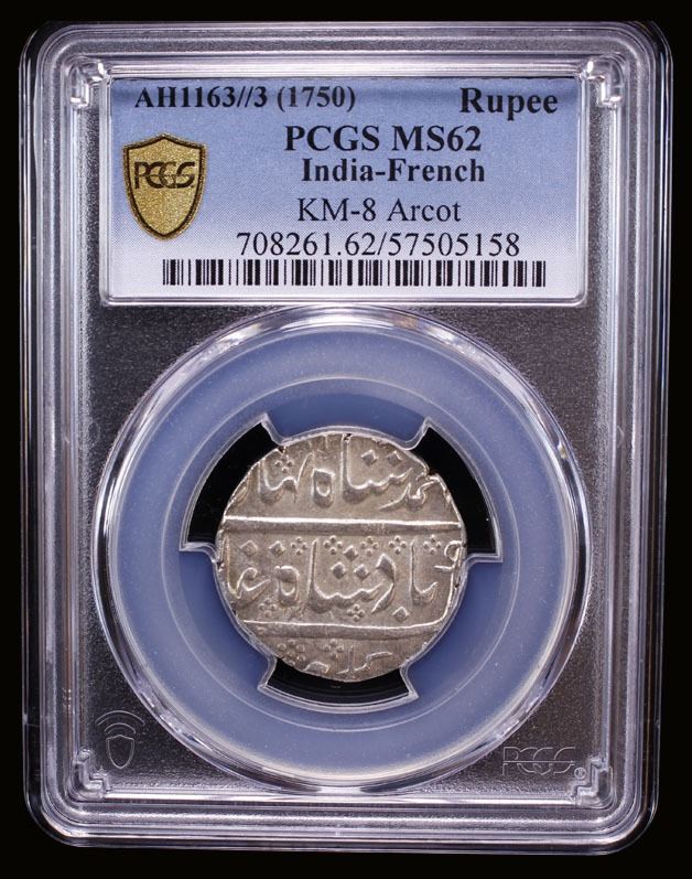 FRENCH INDIA: AR rupee (11.49g), Arkat, year 3, KM-8, Lec-99, struck in the name of Ahmad Shah Bahadur, PCGS graded MS62.
