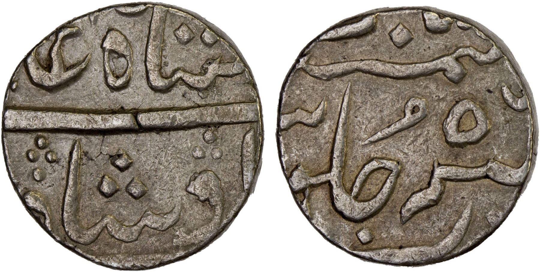 FRENCH INDIA: AR rupee (11.54g), "Surat", year 56, Stv-6.164, in the name of Shah Alam II, only the year 46 of this type is firmly assigned to the Bombay Presidency; all other years belong to other issuers, likely French for most of the years, bold VF, RR.