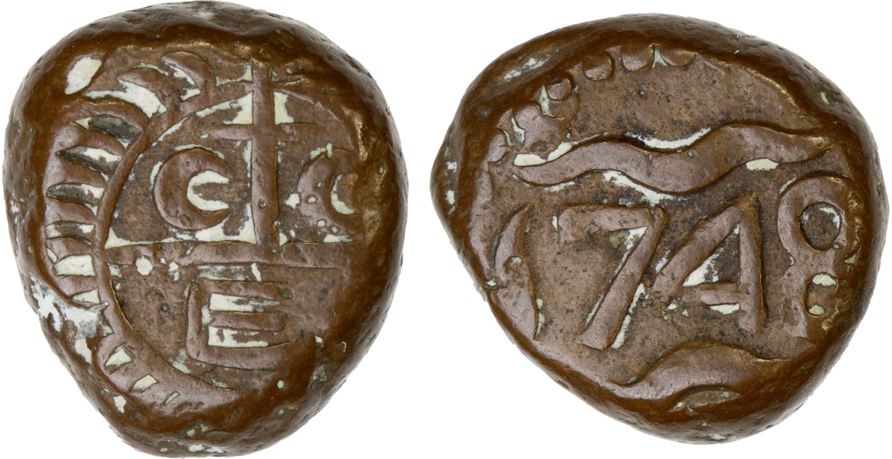 FRENCH INDIA: French Occupation of Madras, 1746-1479, AE dudu (8.59g), 1748, Stv-5.4, KM-291. Prid-41, struck at the Fort St. David mint; with the GCE balemark (British!) on the obverse, date on reverse, pleasing VF, RRR. Struck between the French capture of Madras in September 1746 and the return to British ruler by the Treaty of Aix-la-Chapelle in January 1749.