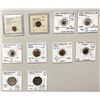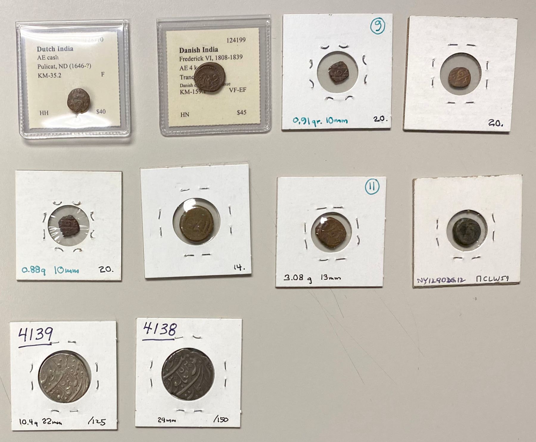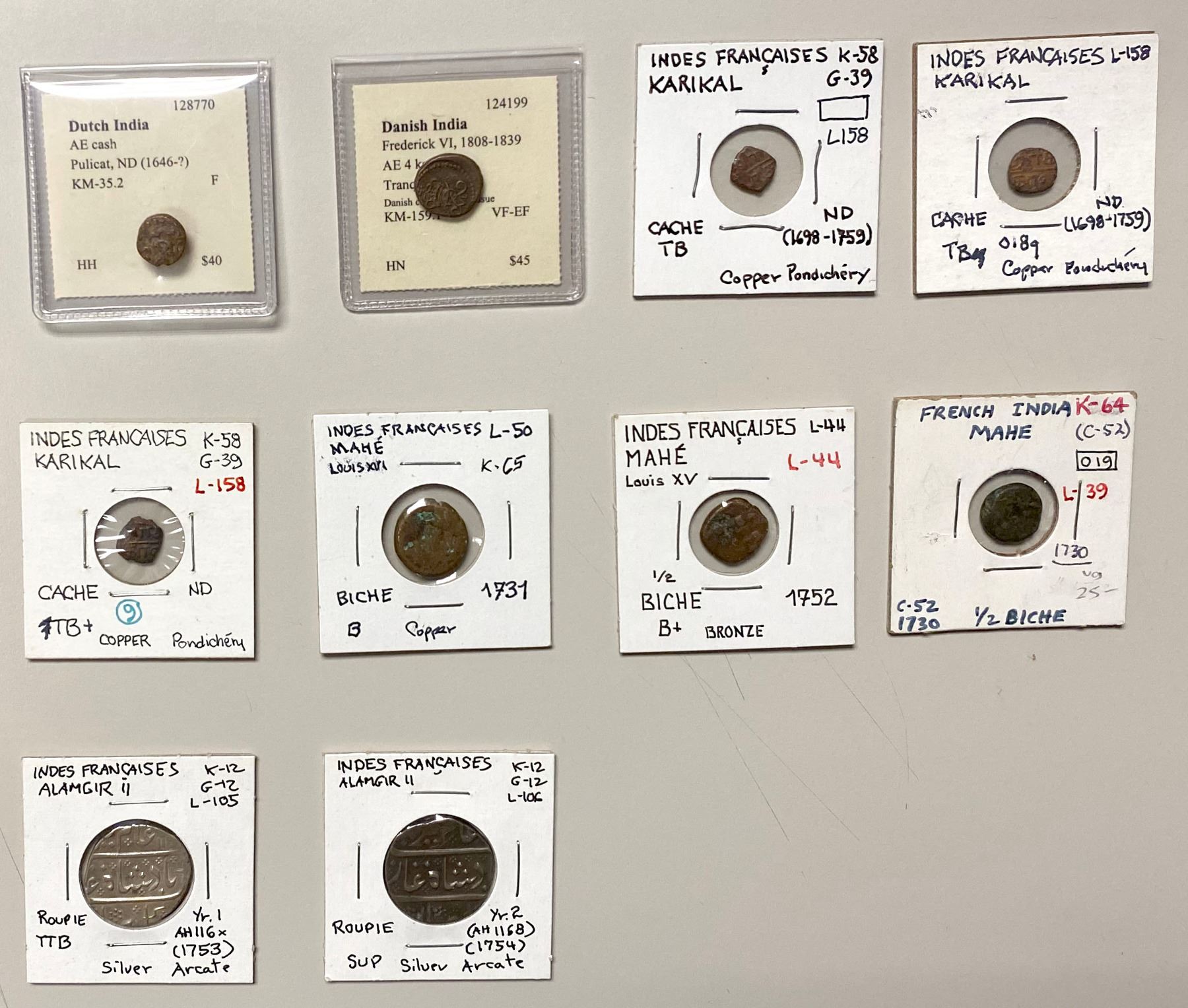 FRENCH INDIA: LOT of 2 silver & 8 copper coins, including Arkat: AR rupee, KM-12, two pieces, year one and year 2, both strong VF; Mahé: KM-64, AE ½ biche, 1730 (Fair) and 1752 (G-VG), plus KM-65, AE biche 1731 (Good); Karikal: KM-58, AE cache, three pieces, average crude Fine; Dutch India: Pulicat, KM-35.2, undated, Fine; and Tranquebar: KM-159.1, AE 4 kas 183x (VF-EF); retail value $425, lot of 10 pieces, ex Charles W. Lueders III Collection.