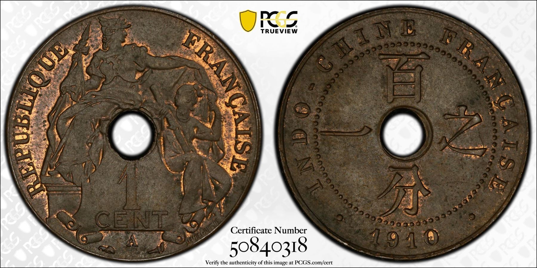 FRENCH INDOCHINA: AE centime, 1910-A, KM-12.1, a pleasing robust chocolate brown mint state example, PCGS graded MS62 BN.