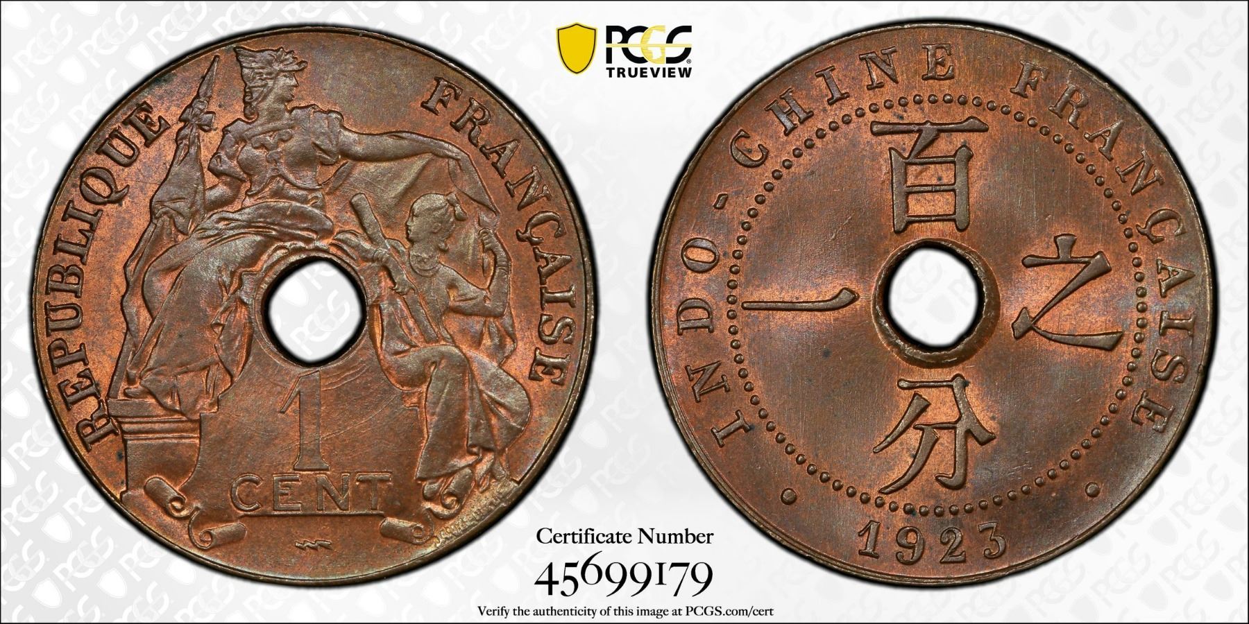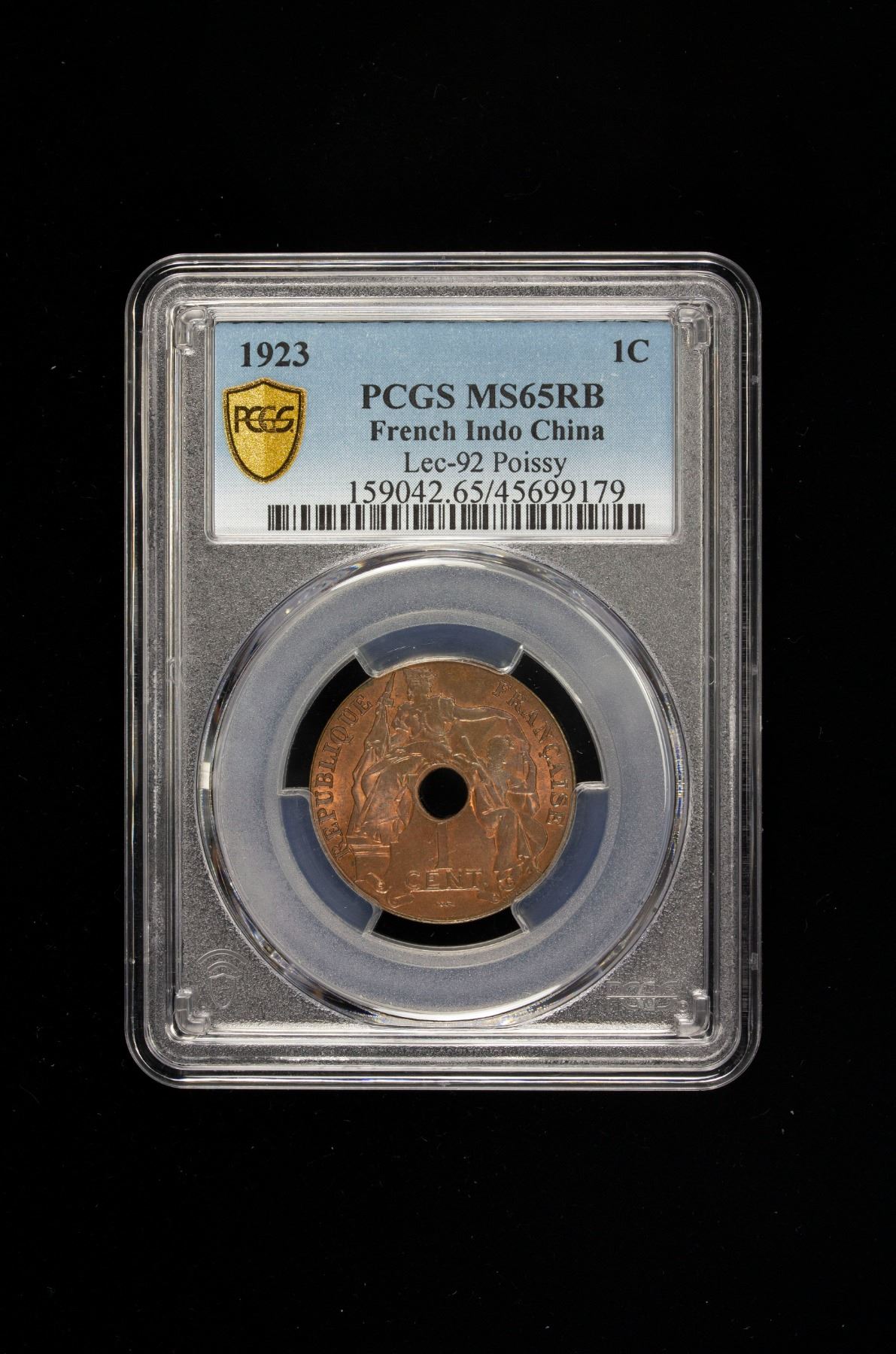 FRENCH INDOCHINA: AE centime, Poissy, 1923, KM-12.3, Lec-92, a superb lustrous example! PCGS graded MS65 RB. The mint of the French Coinage Company of Poissy (l'Atelier Monétaire de la Société Française de Monnayage de Poissy) was established in 1922. The headquarters of the company was in Paris. The Poissy Mint used a thunderbolt mint mark on the coins of France, its colonies, and other countries. The mint was closed on the 31st of December 1927, due to the fierce international competition on the coin producing market.