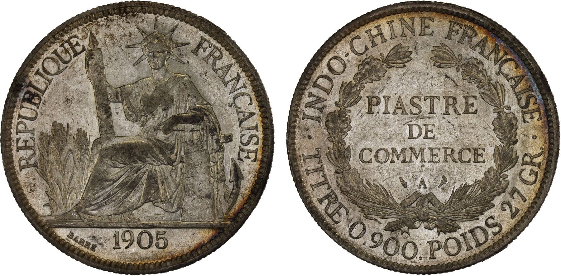 FRENCH INDOCHINA: AR piastre, 1905-A, KM-5a.1, Paris mint, surface hairlines and small marks, lustrous, AU.
